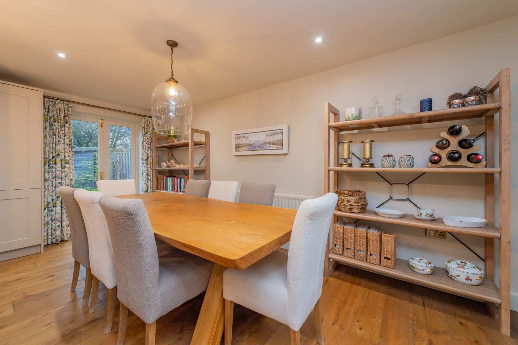 The dining area is a beautiful, light space, featuring two charming arched windows with original iron bars to the front elevation. Double doors open directly onto the peaceful rear courtyard garden, offering a seamless flow for entertaining.