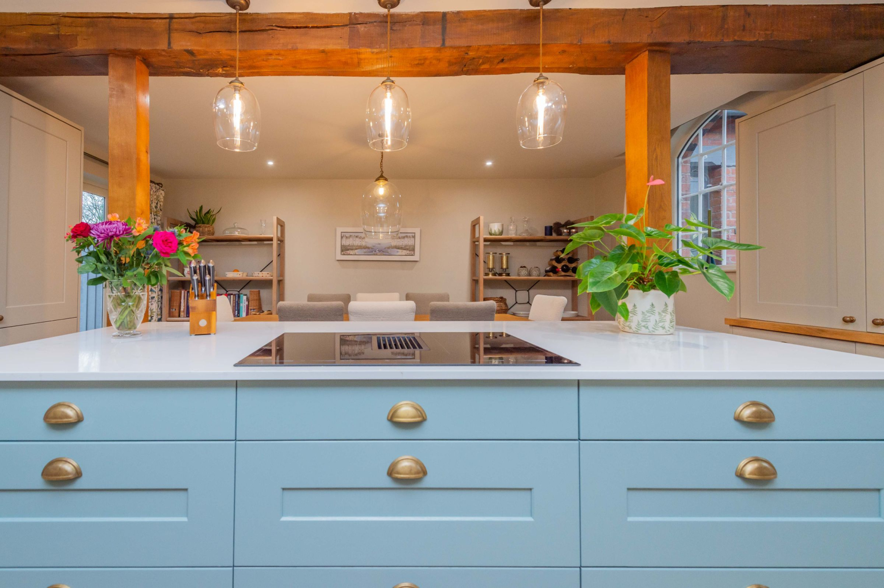 The heart of the home is the impressive and generously sized kitchen/dining area, recently enhanced by the owners with impeccable taste. This country-style fitted kitchen is perfectly harmonised with the building's character. The central island is a duck-egg blue, contrasted by cream wall units, and features a sophisticated integrated SMEG induction hob with integrated storage and a welcoming breakfast bar-perfect for casual dining or socialising while cooking. The culinary space is completed by a beautiful Belfast sink with a copper mixer tap, copper cupboard handles, integrated SMEG double ovens, and separate full-height fridge and freezer, all set against elegant white quartz worksurfaces. Exposed timber ceiling beams and full-height structural beams naturally frame the island, subtly distinguishing the culinary area from the dining space beyond.