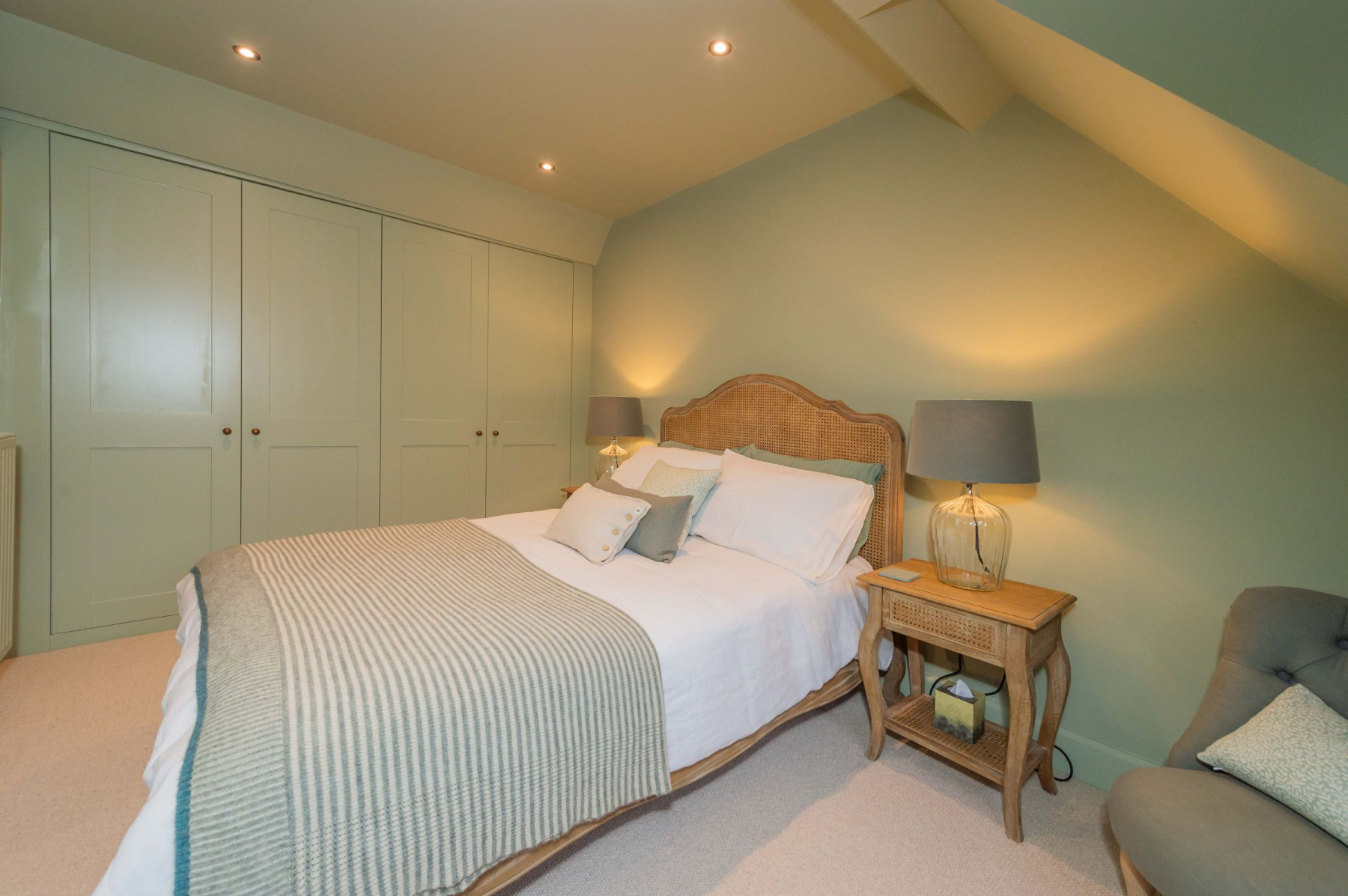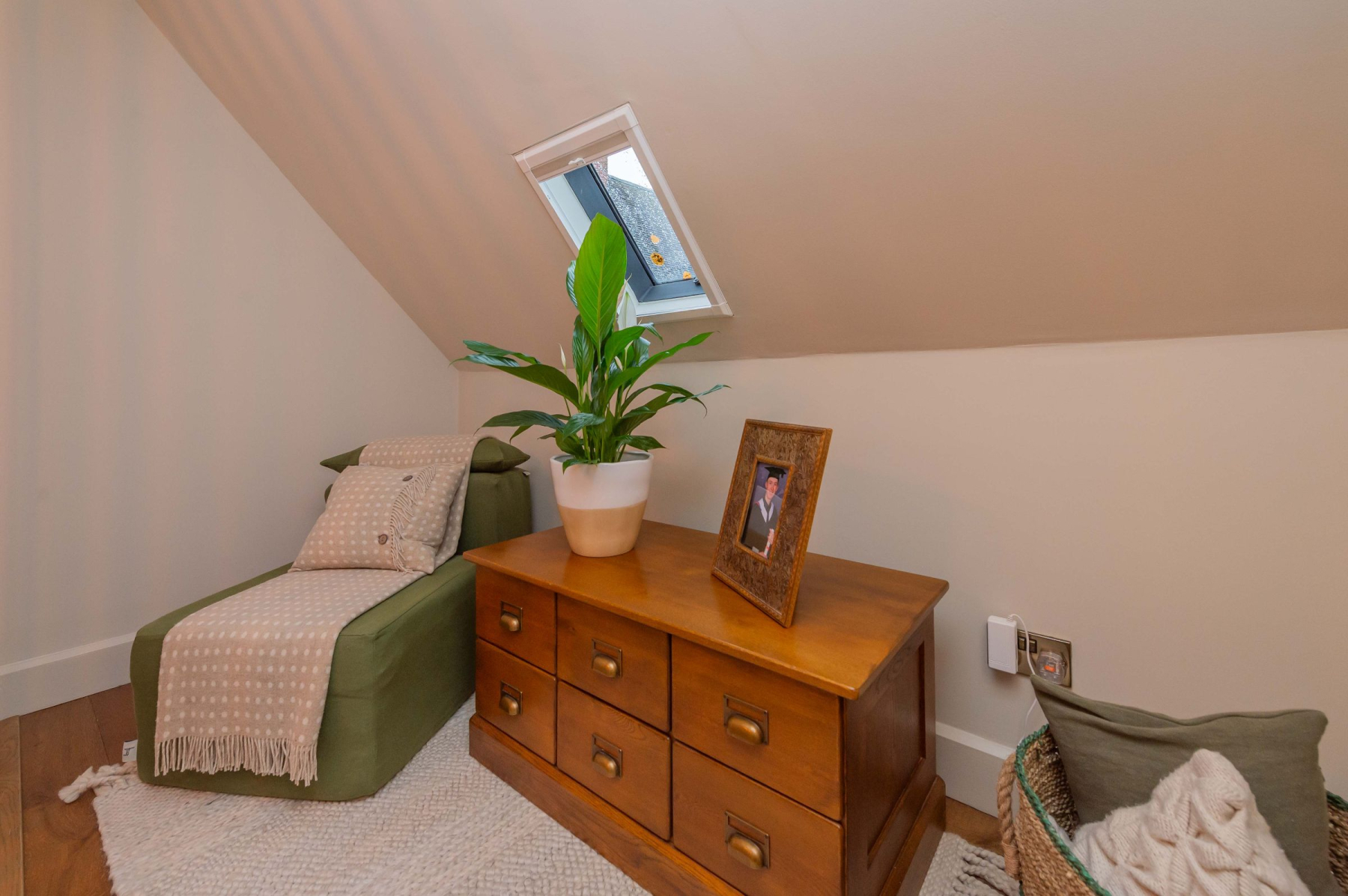 The turn staircase, which is finished with a plush cream carpet that extends throughout the upper floor, leads to a striking galleried landing. A mezzanine area provides a perfect spot for quiet contemplation, featuring a floor-to-ceiling painted timber balustrade. Bedrooms 1 and 2 are a mirror image of each other, both offering luxurious, thoughtfully designed private spaces. The Master Bedroom (Bed 1), painted in a soft pink, is accessed via an initial dressing area with a skylight; the main bedroom is a double room with a full-width built-in wardrobe and a charming dormer window providing views over the private frontage. Exposed brickwork and an engraved stone bearing the building's age-1754-serve as a powerful and beautiful link to the property's past. The first ensuite is a haven of modern luxury, featuring a panelled bath with a mixer tap and handheld shower, a separate shower cubicle with both a rainfall and a separate shower head, a WC, a wide vanity basin with storage, and a fitted floor-to-ceiling storage cupboard, all finished with complementary tiled floors and walls. Bedroom 2 is painted in a soft green and also features a dedicated, skylight-lit dressing room leading into the main bedroom area. This room has a built-in wardrobe and a dormer window to the front, and the second ensuite includes a corner shower cubicle, a WC, a vanity basin with storage, and a skylight, complemented by a full-length built-in wardrobe.