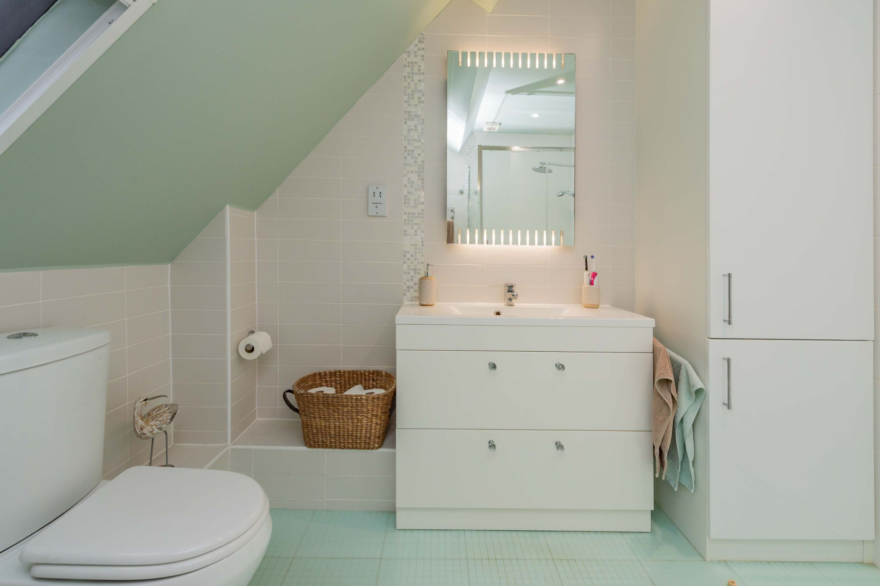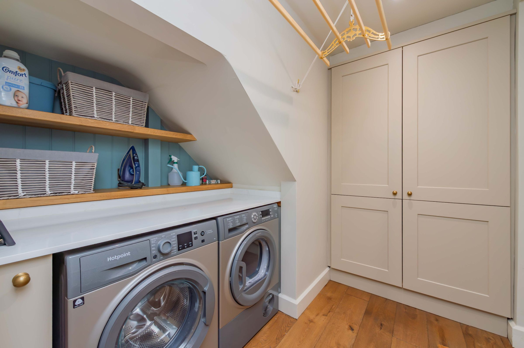 The ground floor is completed by a handy utility room and a modern cloakroom. The utility room is a spacious, practical space with cleverly created storage solutions. The under-stair area houses plumbing and space for a washing machine and tumble dryer, topped by a useful worksurface and shelving. Built-in storage has been added to house the boiler, offering additional valuable storage and a rail for hanging clothes. A door from the utility room provides convenient access to the enclosed courtyard garden. The modern cloakroom features a wide vanity basin with storage beneath and a contemporary WC.