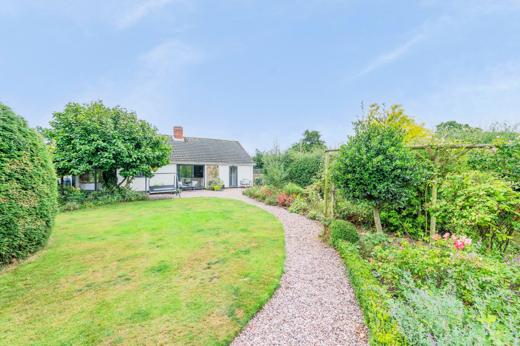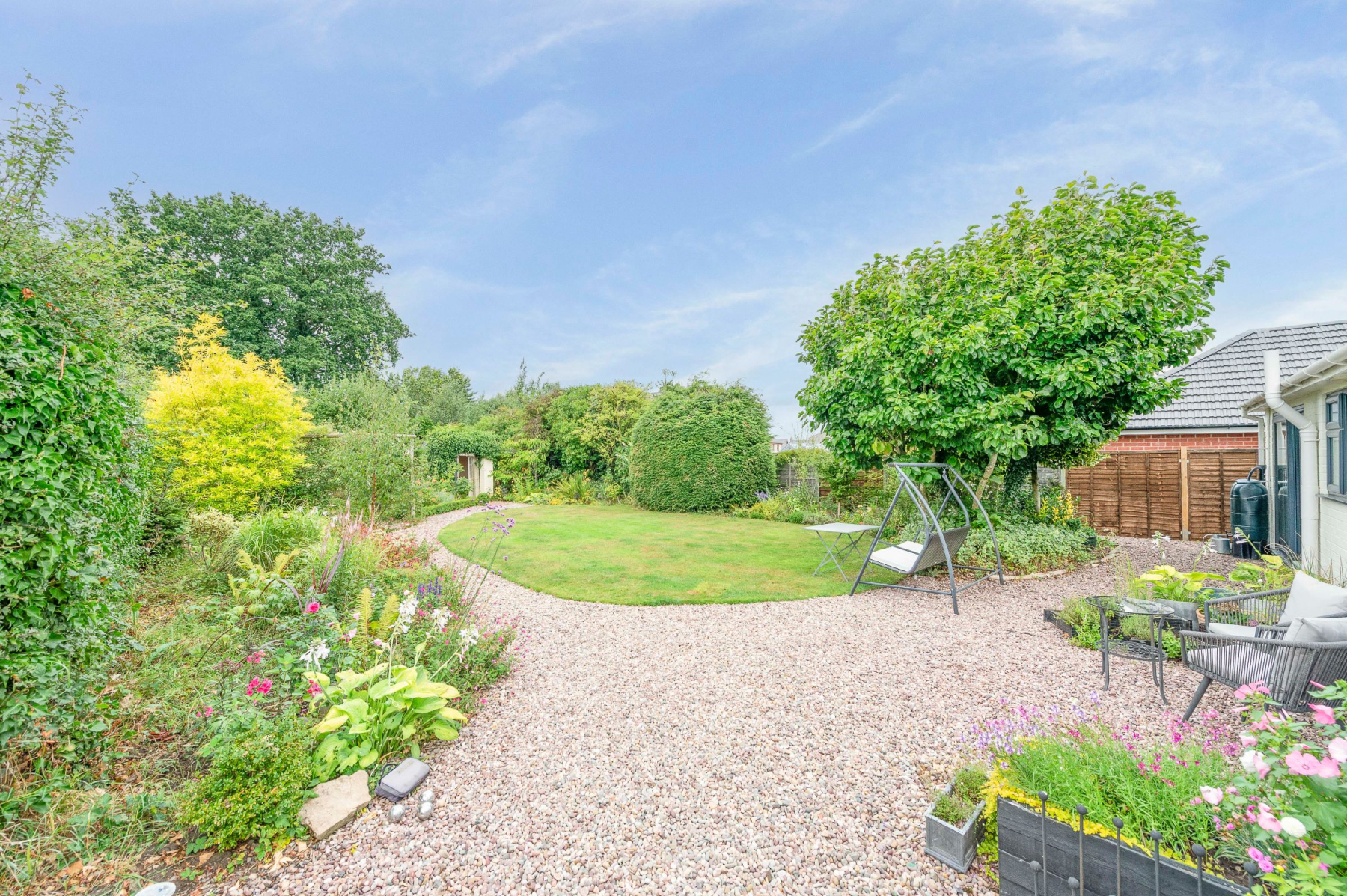 The true magic of Highdrive lies in its captivating outdoor space. The current owners have completely reimagined the garden, dividing it into enchanting "rooms" for you to explore. A golden gravel sitting area provides the perfect spot for morning coffee, while a meandering path leads you through a formal lawn & wide borders bursting with a curated selection of low-maintenance perennials.