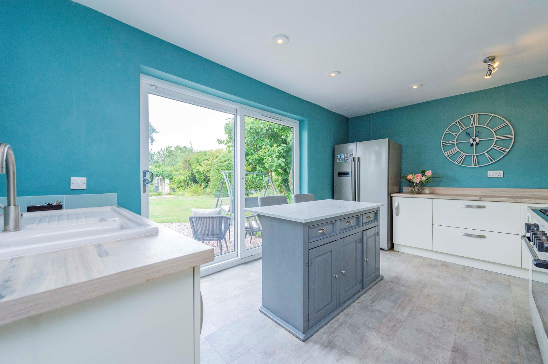 The dining room leads to the modern kitchen, a space designed for both beauty and function. Floor-to-ceiling French sliding doors provide breath-taking views of the landscaped garden, while cream units and a traditional-looking stove with a five-ring gas hob offer a perfect blend of classic and contemporary design. A separate utility room provides practical space for laundry and storage, and a convenient cloakroom with a modern WC completes the ground floor.
