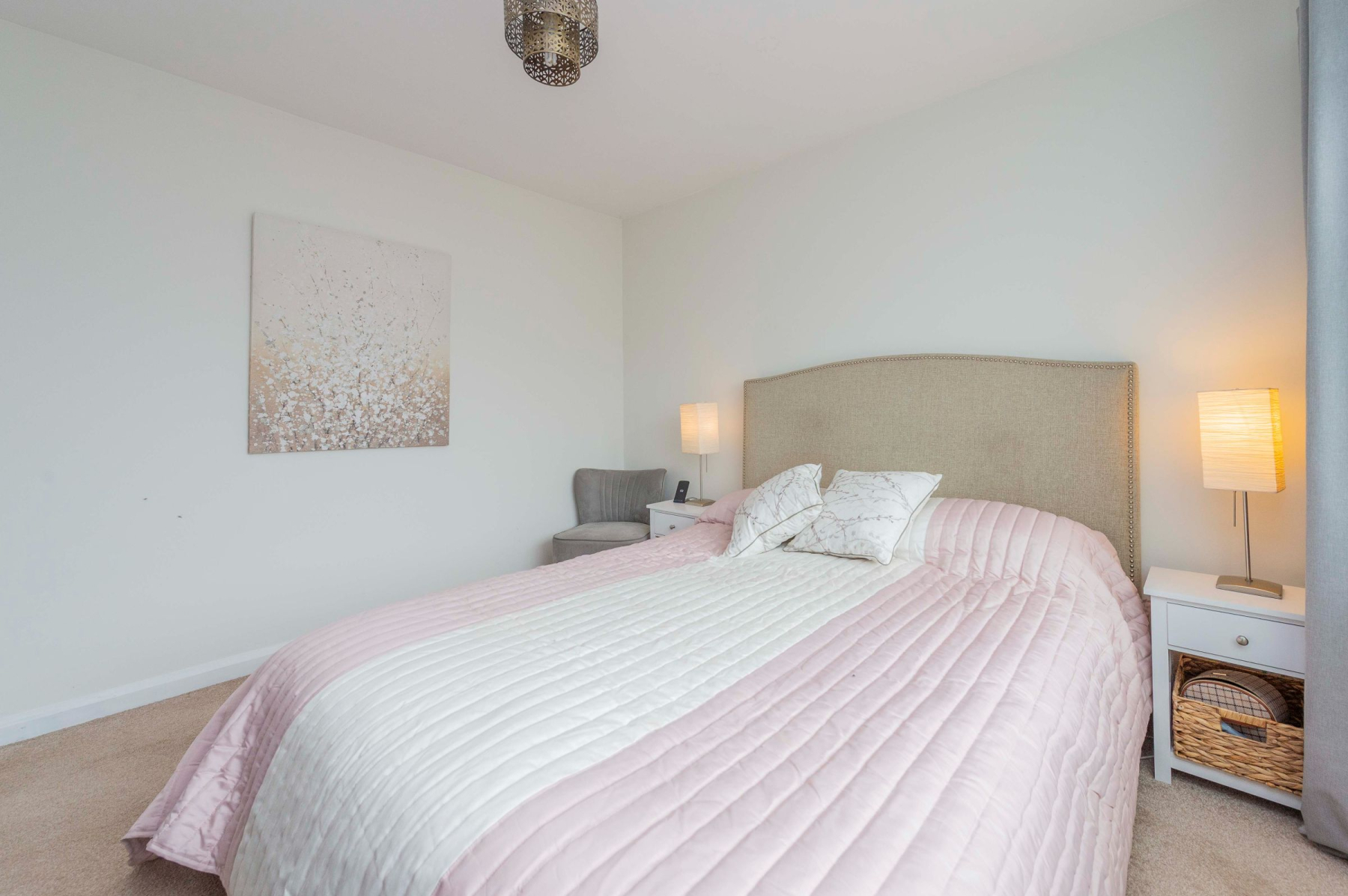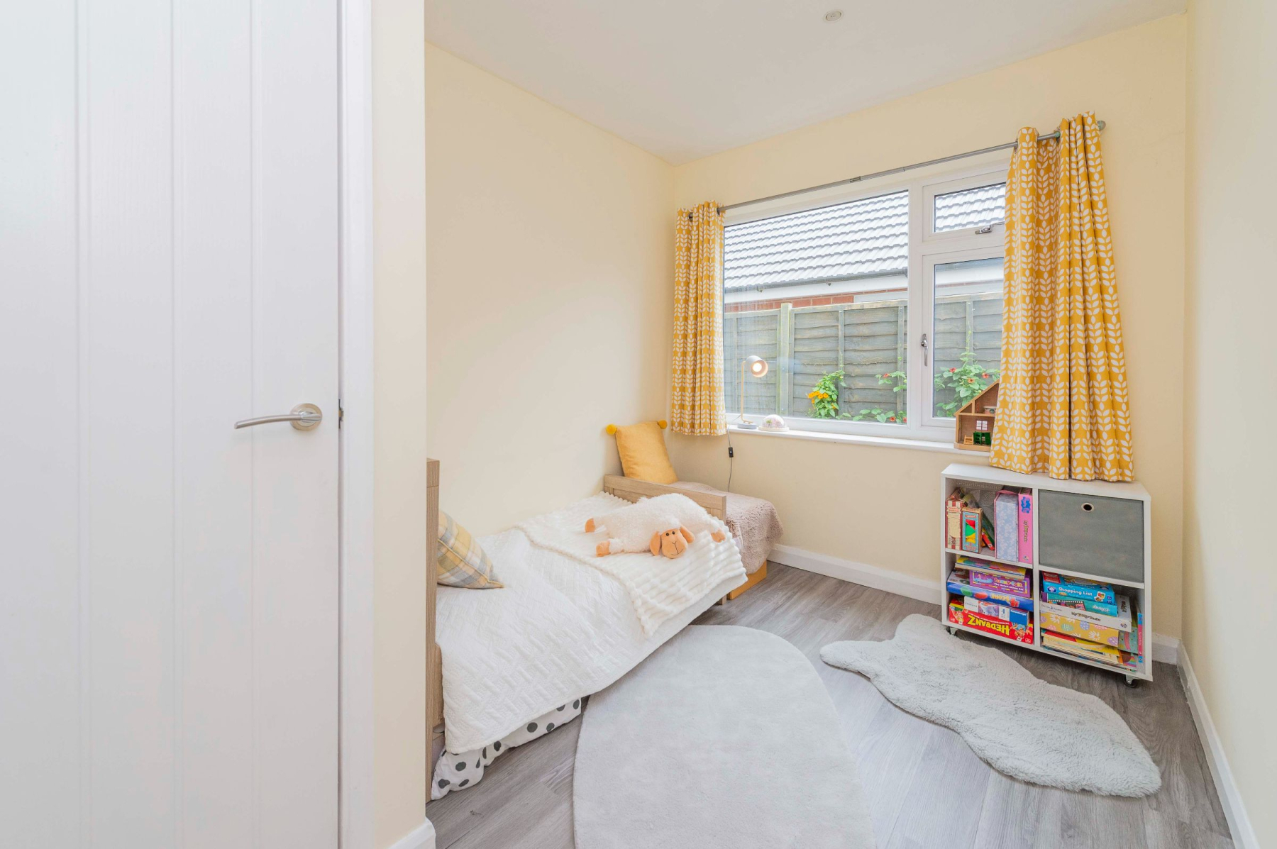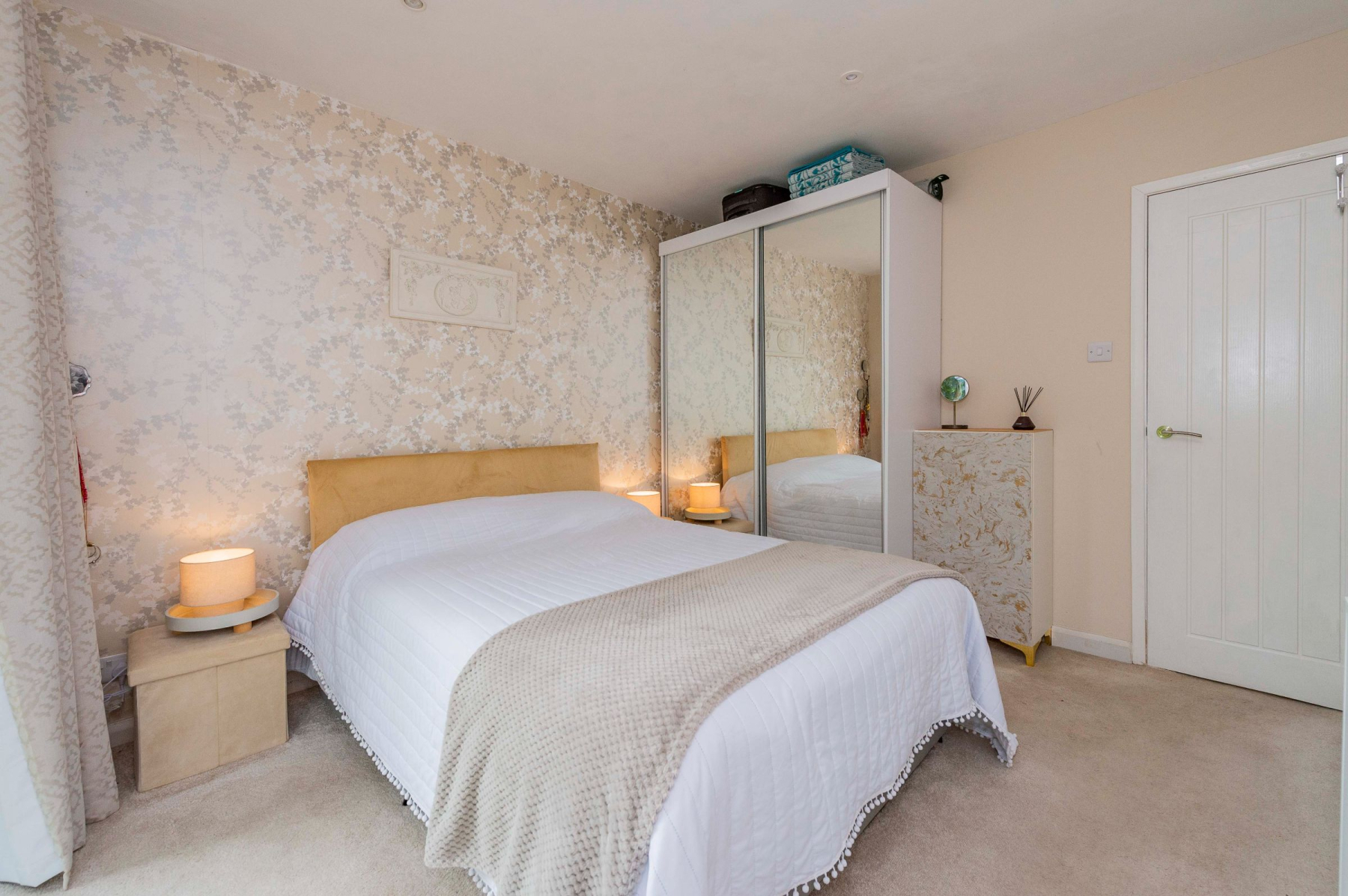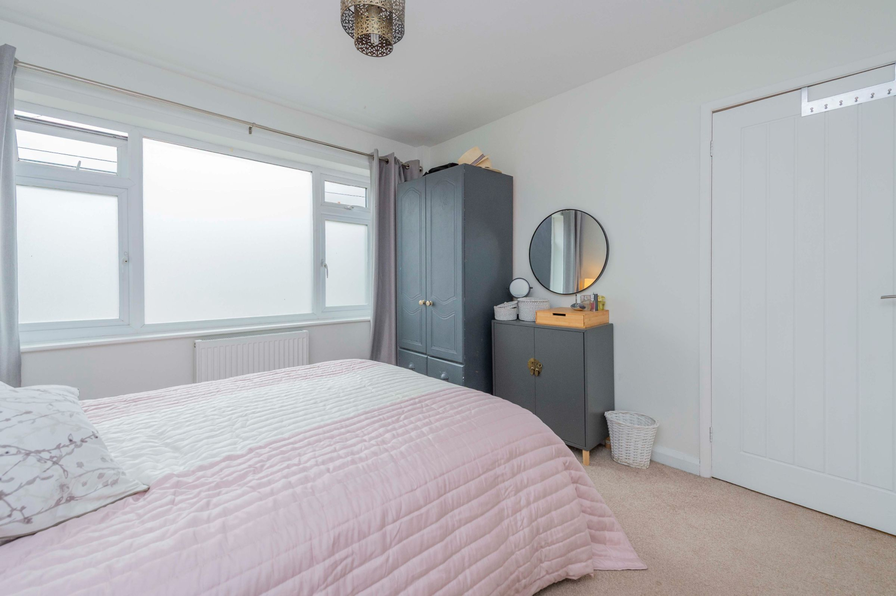 The property features two double bedrooms and one single. The main double bedroom overlooks the rear garden and includes a fitted wardrobe with mirrored sliding doors and a private sliding door leading directly outside. A second double bedroom is located at the front, while the single bedroom is situated to the side. The stylish family bathroom boasts a panelled bath, a vanity basin, and a walk-in shower with both rainfall and handheld showerheads, finished with a heated towel rail and modern fixtures.