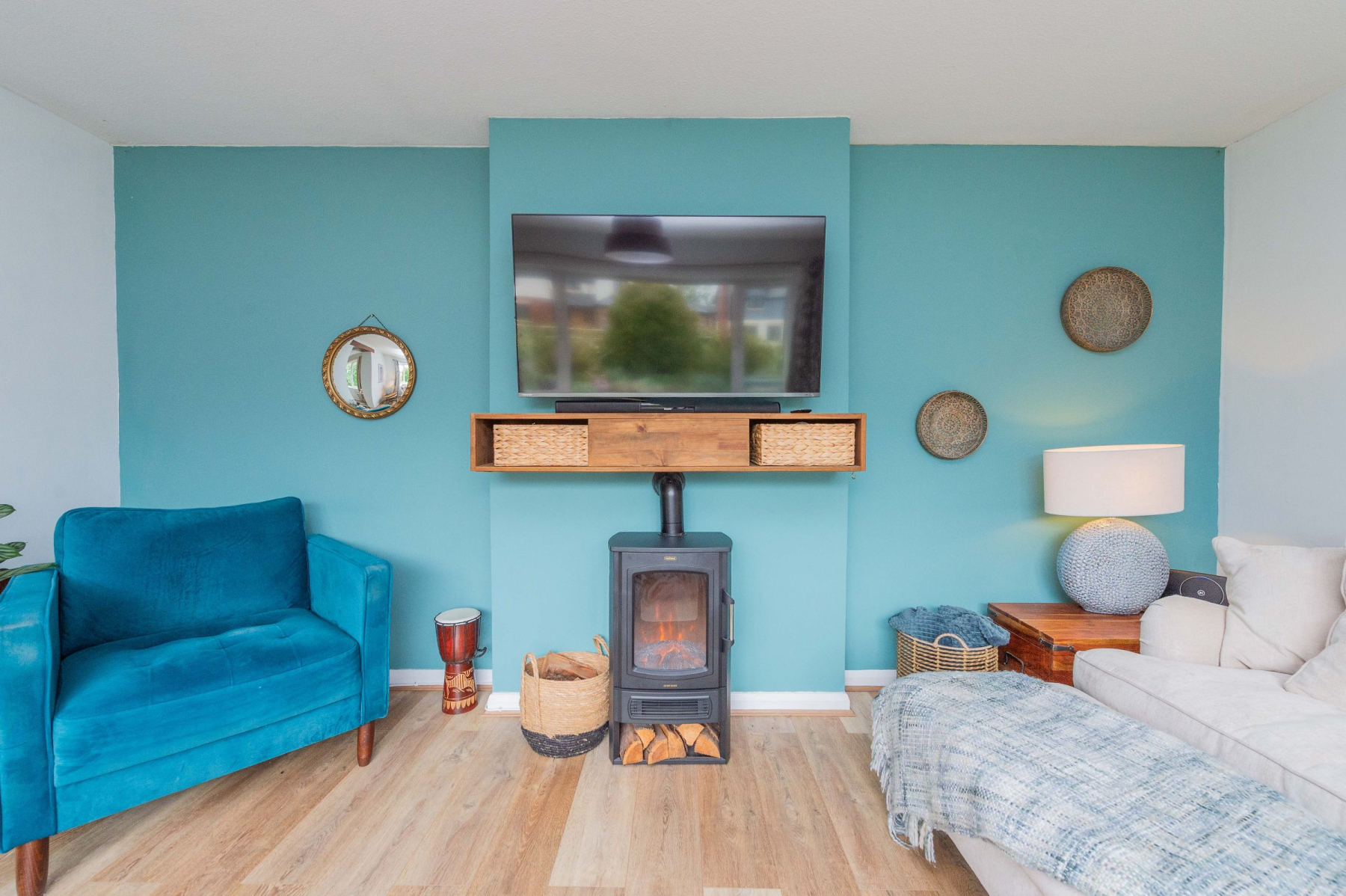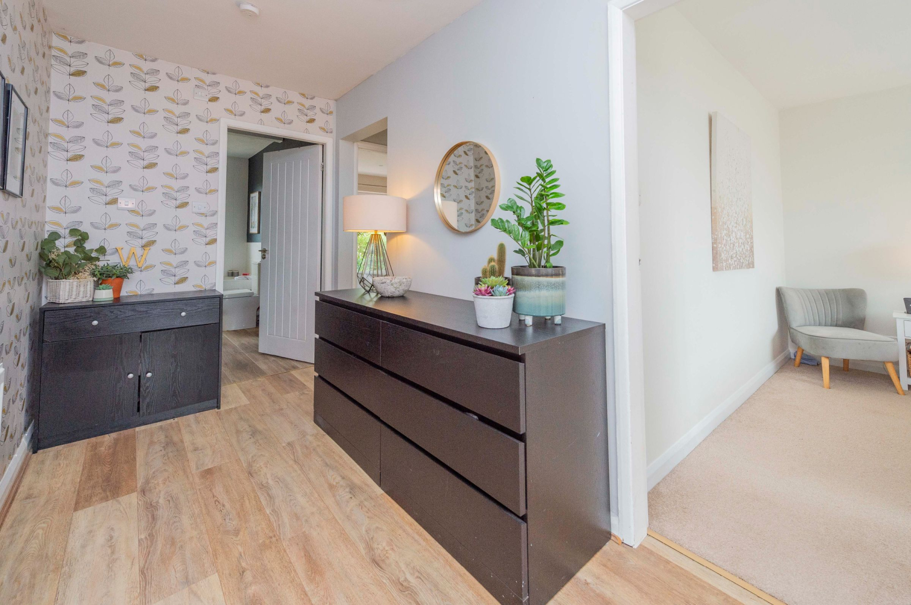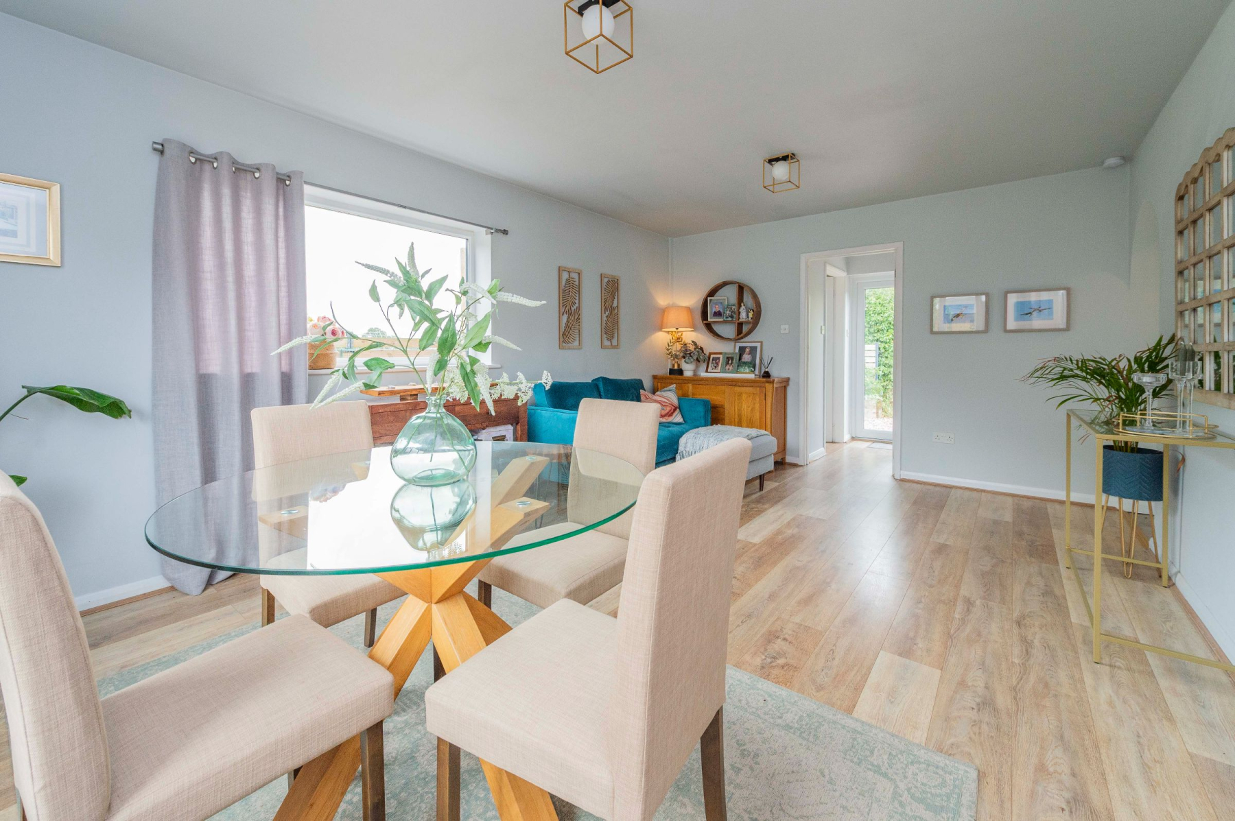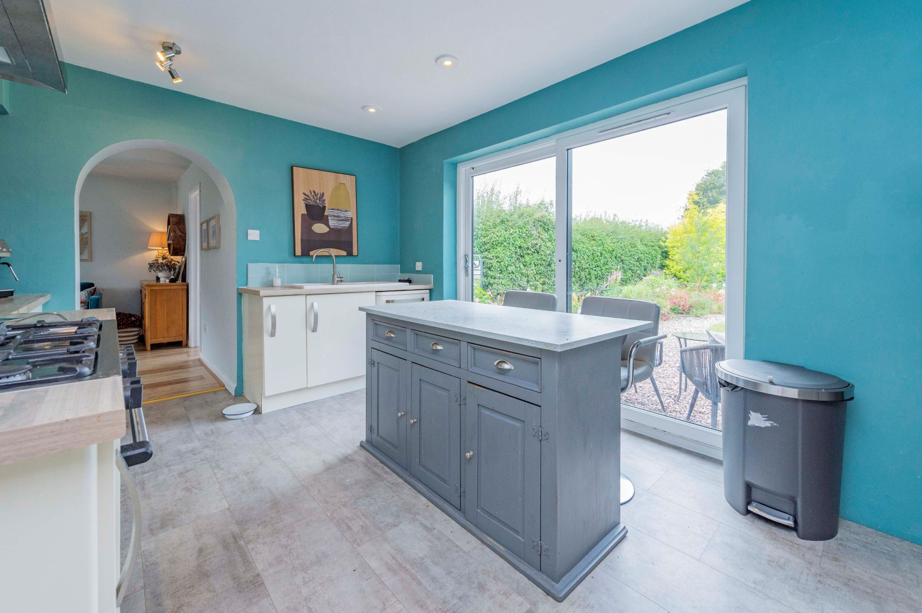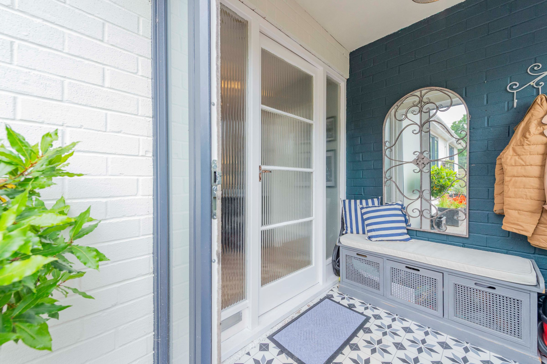 Approaching the home, you're greeted by a brick-paved driveway flanked by a well-stocked, raised flowerbed. The sleek anthracite front door opens into a charming porch, featuring patterned tiled flooring and painted brick, setting a tone of modern elegance from the moment you arrive. A glazed door leads into the welcoming hallway, which provides access to the family bathroom and all three bedrooms.