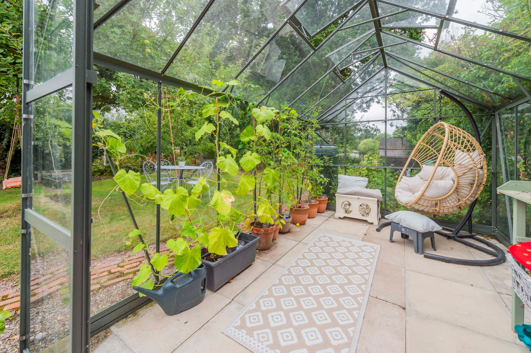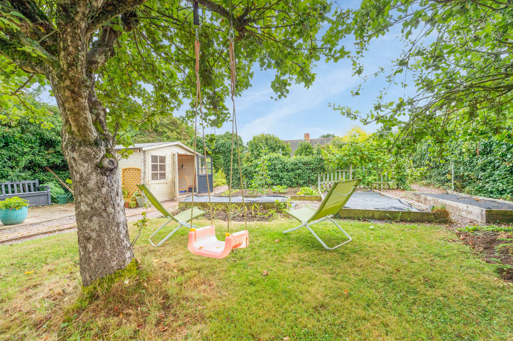 Mature shrubs & trees provide structure and shade, while an archway with climbing plants leads to a dedicated David Austin rose garden. Beyond this, you'll discover a productive section featuring raised vegetable beds, a greenhouse & a lovely summerhouse-the ideal spot for quiet reflection. The garden is a haven for year-round colour and produce, with four apple trees, damson, pear, and a variety of soft fruit bushes including raspberries, gooseberries, and blackcurrants. Early spring brings a stunning display of snowdrops, daffodils, and bluebells, ensuring a beautiful view no matter the season.
