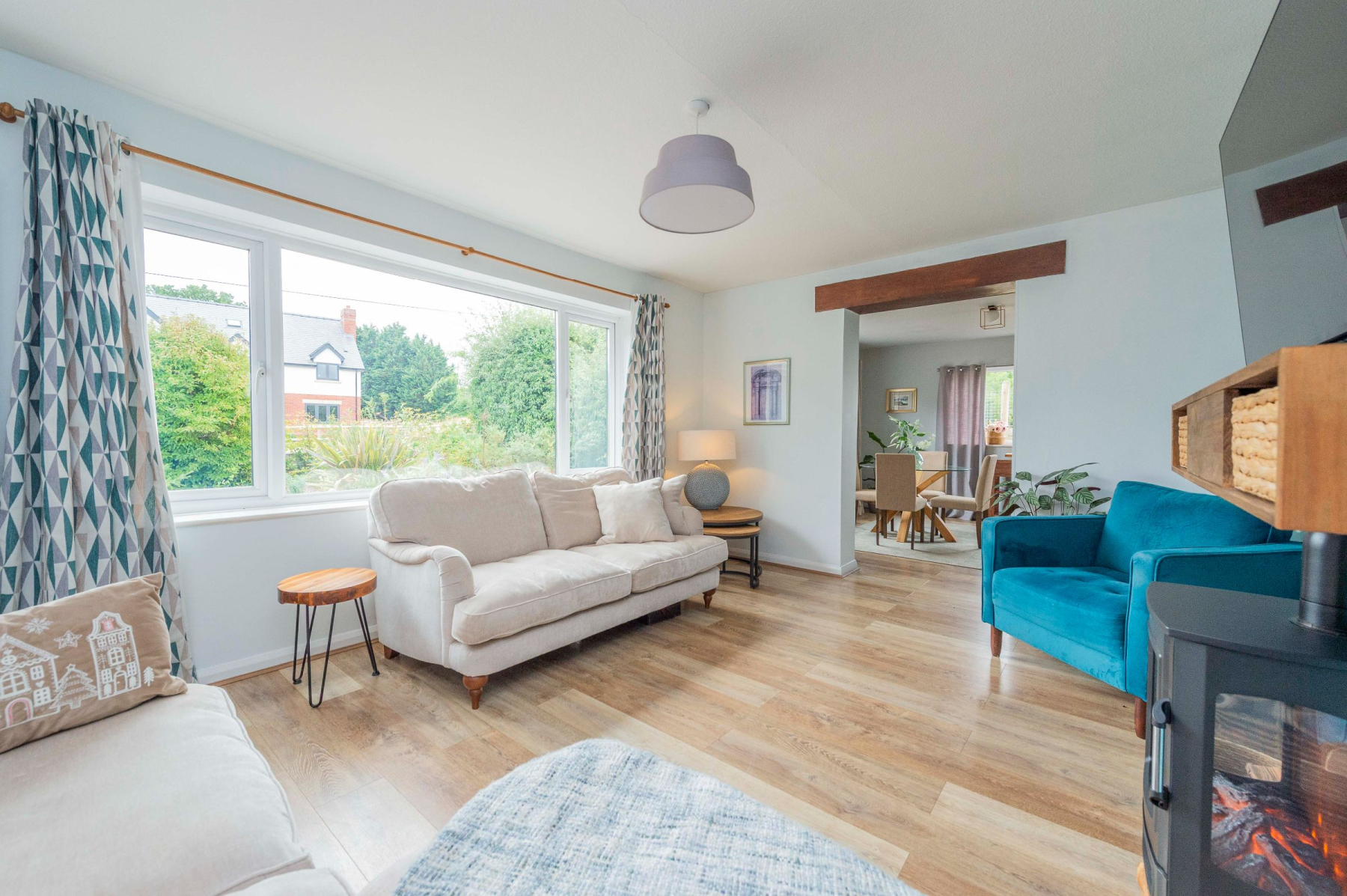 The heart of the home is the bright and inviting lounge, flooded with natural light from a large front-facing window. A feature electric log-burning stove creates a cosy atmosphere, while warm wood flooring flows seamlessly into the adjacent dining room. Here, a charming exposed wood archway adds character, and dual-aspect windows offer picturesque views of the surrounding grazing fields, occasionally visited by longhorn cattle.