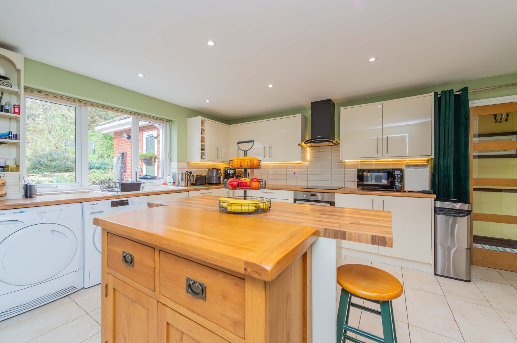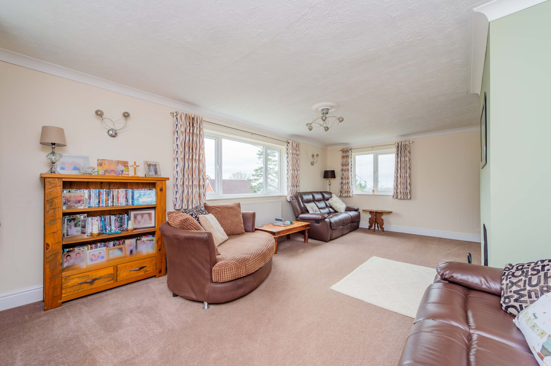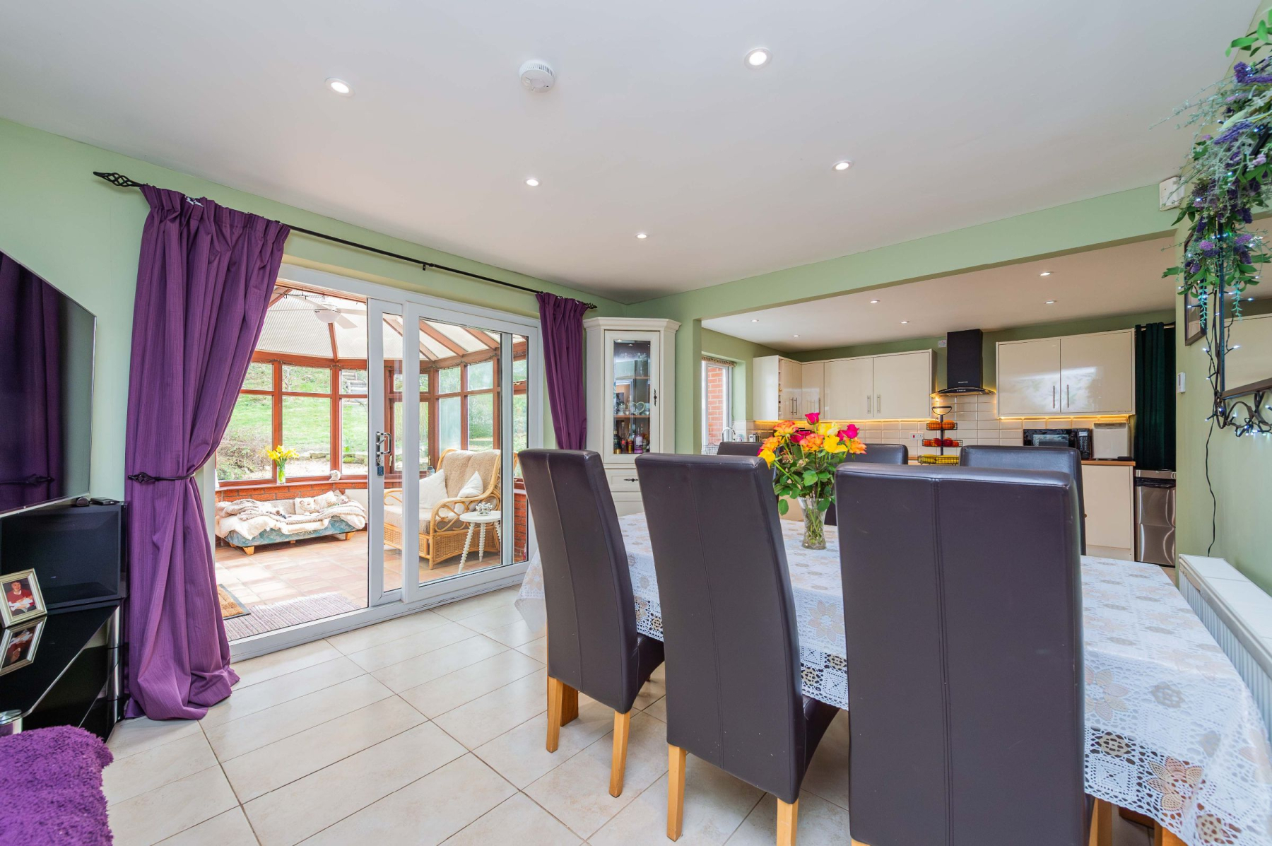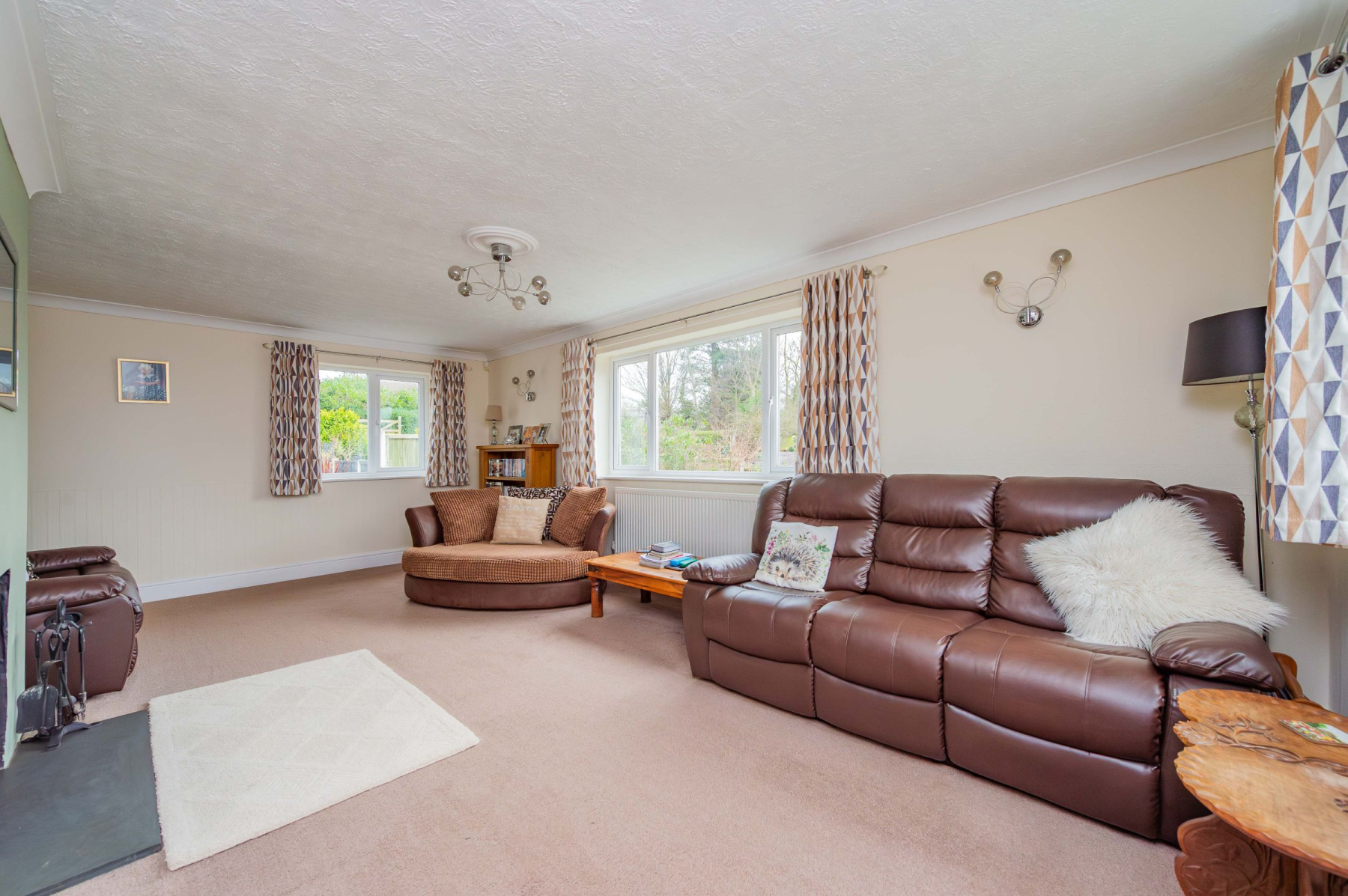 Stepping through the front door, the practical porch offers a dedicated space to shed the day's adventures before entering the spacious welcome hallway. From here, the home unfolds into the magnificent lounge, where three large windows act as living canvases for the panoramic views outside. Underfoot, plush carpet provides a cosy touch, while the log-burning stove stands ready to anchor the room in warmth during the winter months. The kitchen and dining area is equally impressive, defined by sleek cream gloss cabinetry, wood-effect worksurfaces, and a central island that invites morning coffee and conversation. Integrated appliances and an induction hob cater to the modern chef, while the adjoining conservatory extends the entertaining space, blurring the line between the stylish interior and the picturesque rear garden.