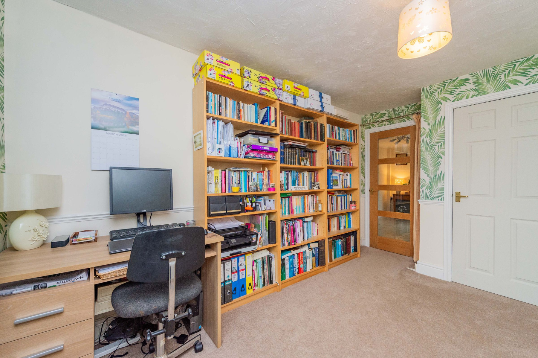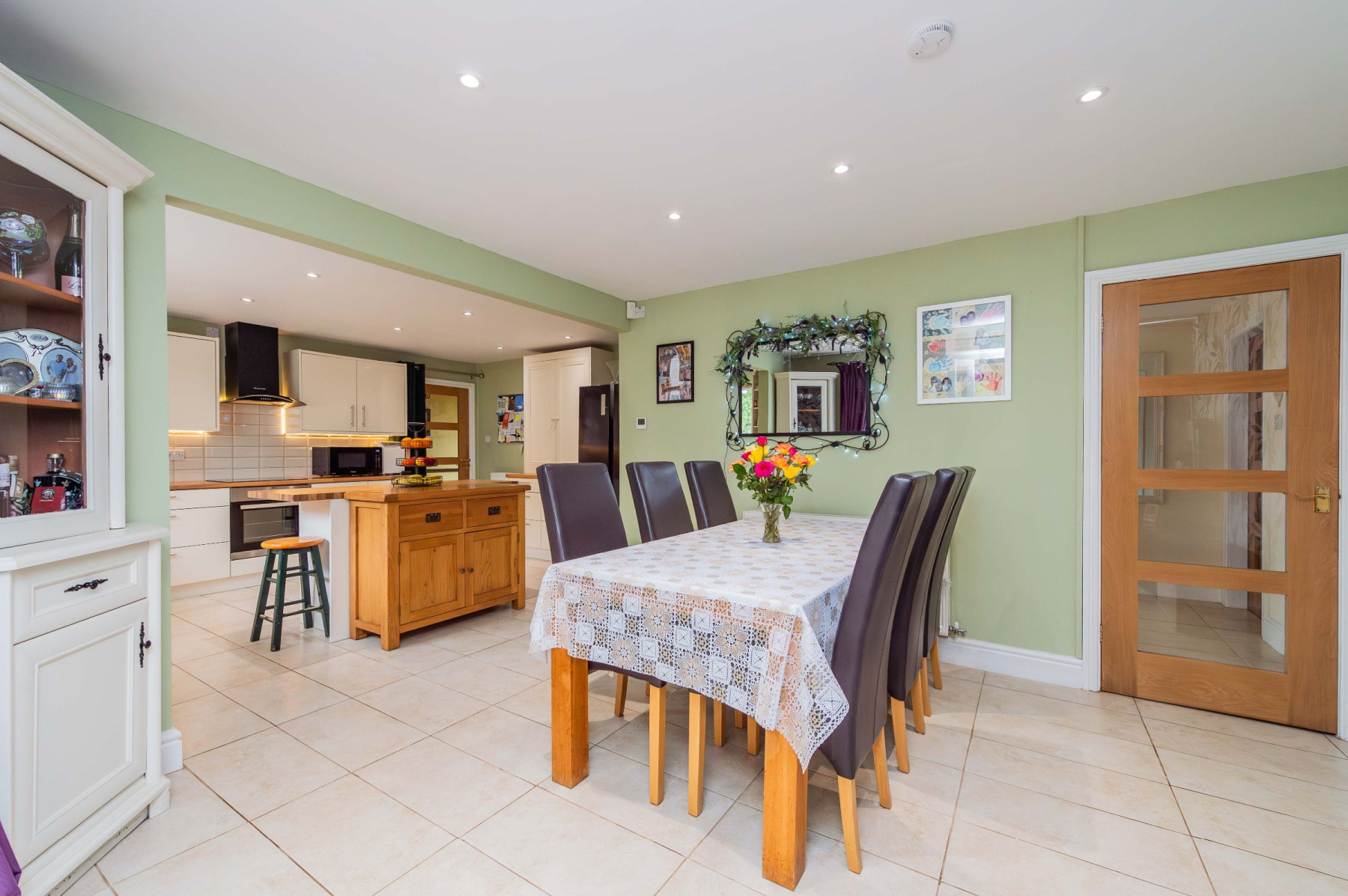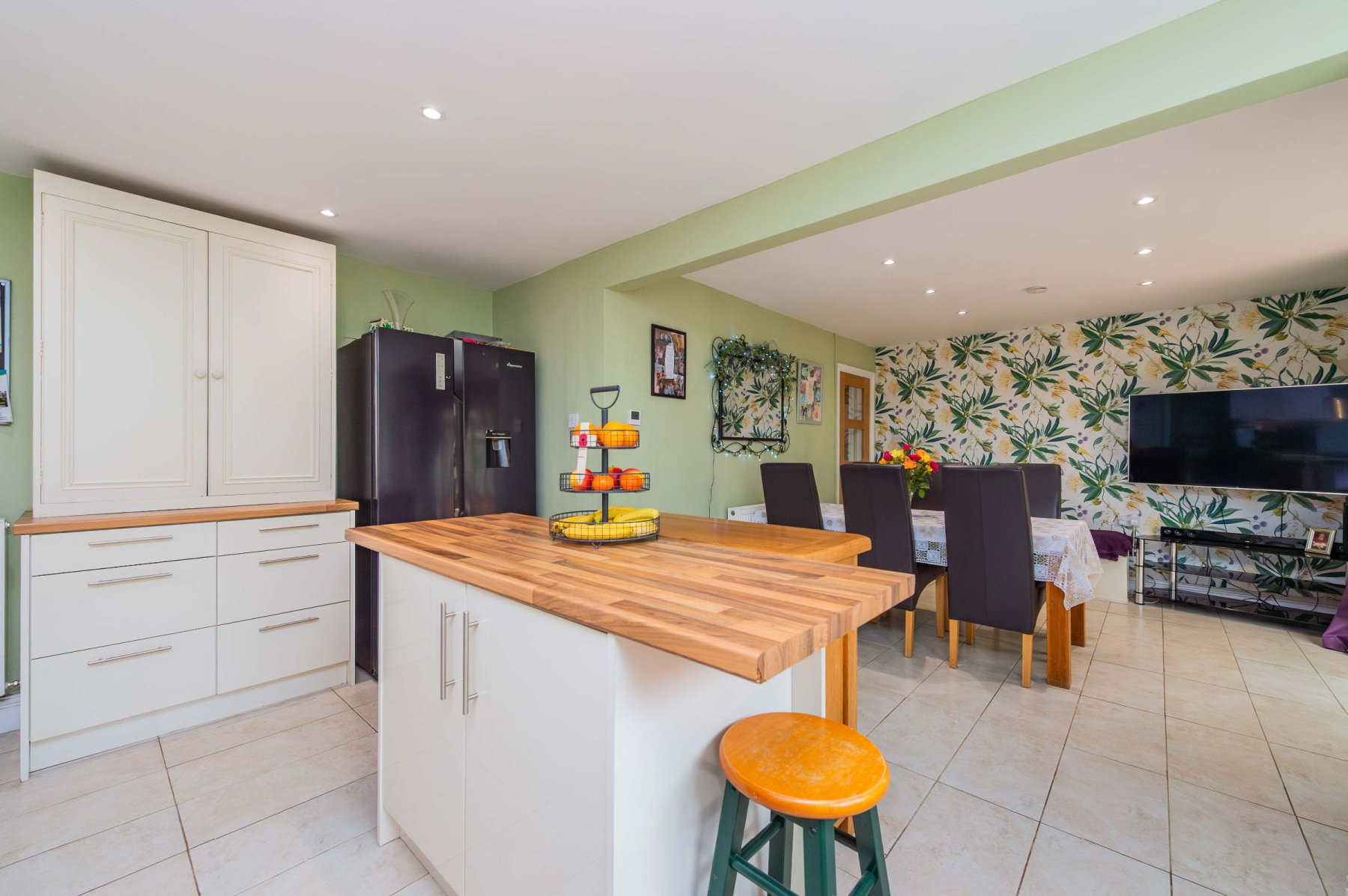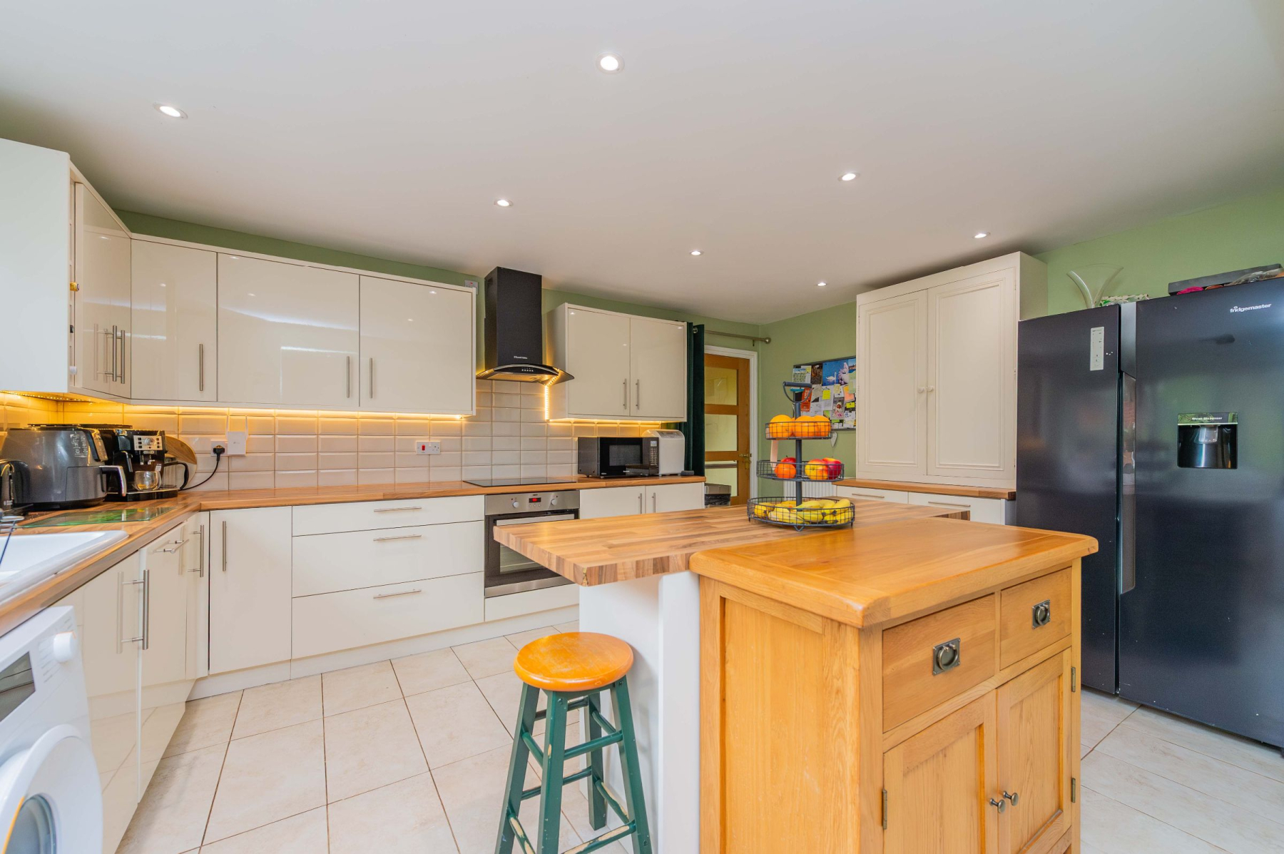 Stepping through the front door, the practical porch offers a dedicated space to shed the day's adventures before entering the spacious welcome hallway. From here, the home unfolds into the magnificent lounge, where three large windows act as living canvases for the panoramic views outside. Underfoot, plush carpet provides a cosy touch, while the log-burning stove stands ready to anchor the room in warmth during the winter months. The kitchen and dining area is equally impressive, defined by sleek cream gloss cabinetry, wood-effect worksurfaces, and a central island that invites morning coffee and conversation. Integrated appliances and an induction hob cater to the modern chef, while the adjoining conservatory extends the entertaining space, blurring the line between the stylish interior and the picturesque rear garden.