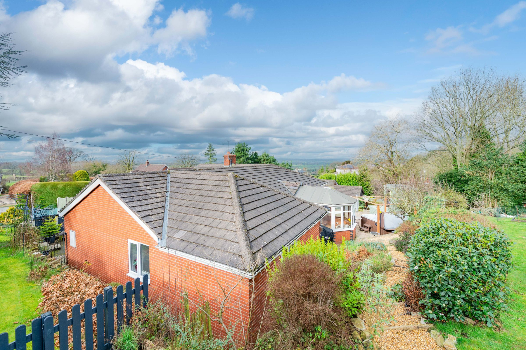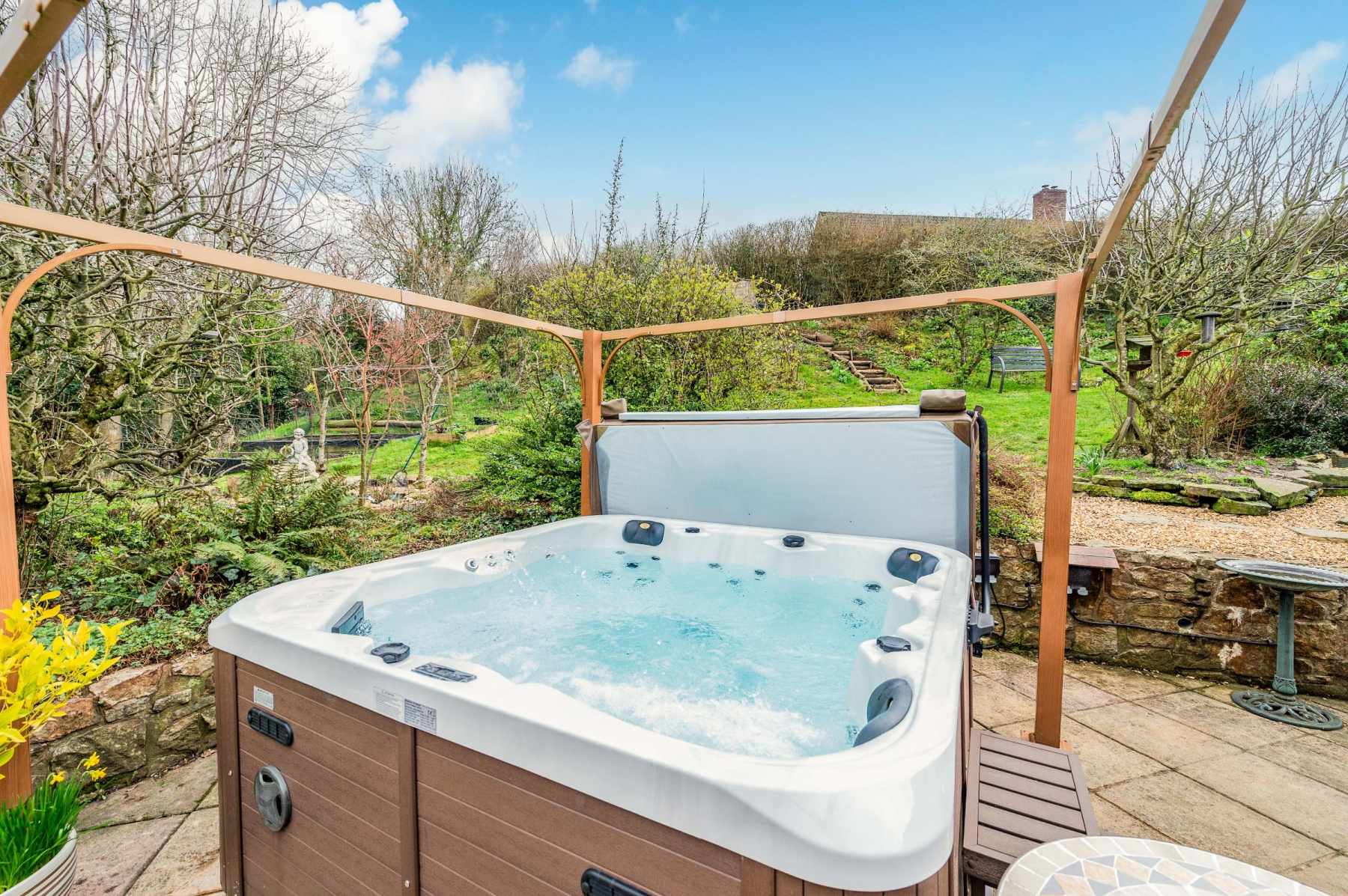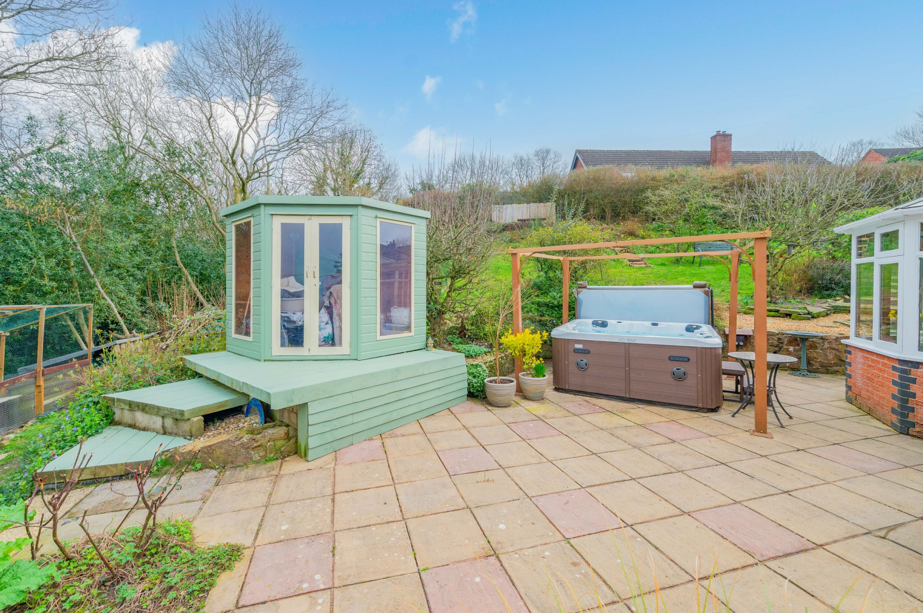 The outdoor spaces at Highlea are designed for both production and relaxation. The wrap-around patio is an entertainer's dream, featuring a stone-walled boundary and a hot tub nestled under a gazebo-the ultimate spot to watch the sun dip below the horizon. As you ascend the garden steps, the plot reveals its "Good Life" credentials. The orchard boasts 12 apple, 2 plum, and 4 pear trees, while the raised beds and chicken area offer a taste of self-sufficiency. At the front, curved paved paths lead through mature borders to hidden seating areas and a greenhouse. The entire perimeter is securely fenced and gated, ensuring a private and safe sanctuary for children and pets alike.