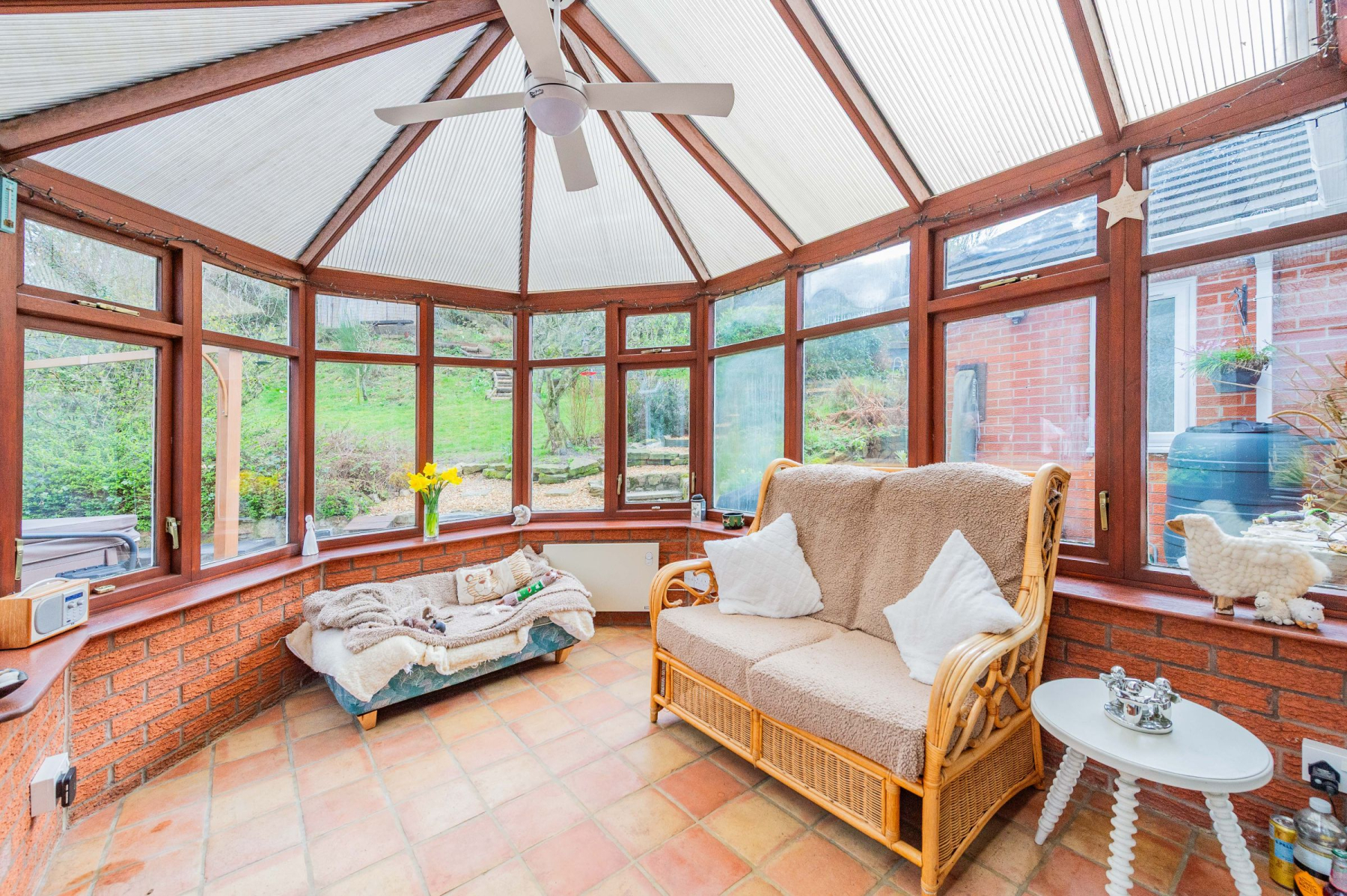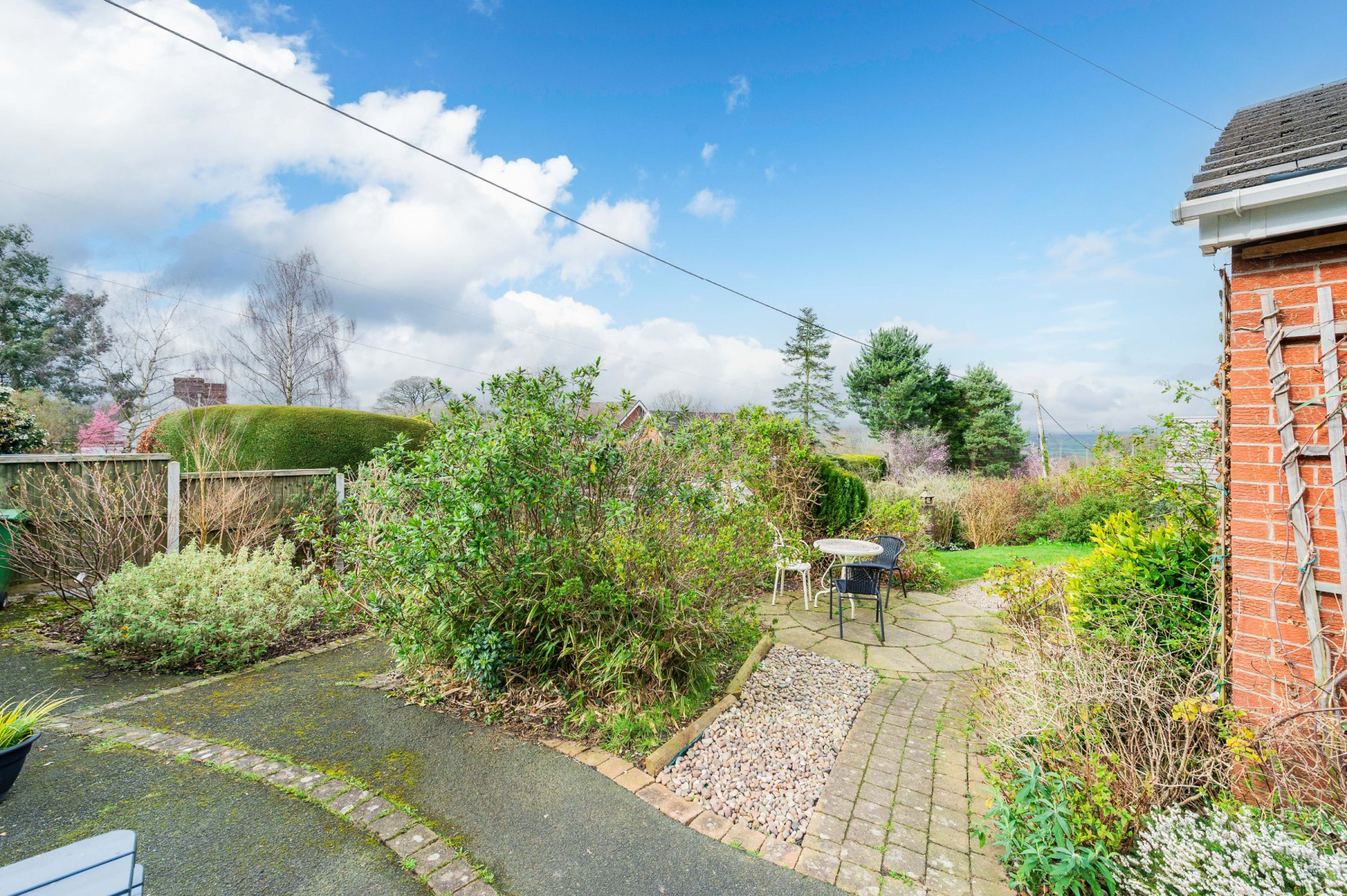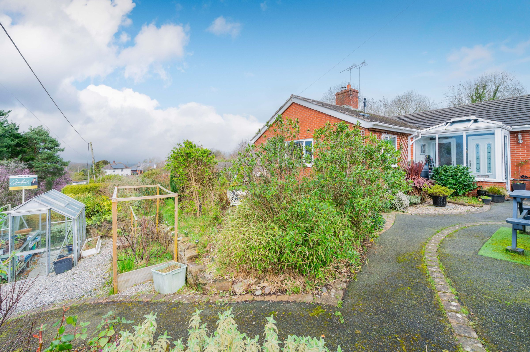 The outdoor spaces at Highlea are designed for both production and relaxation. The wrap-around patio is an entertainer's dream, featuring a stone-walled boundary and a hot tub nestled under a gazebo-the ultimate spot to watch the sun dip below the horizon. As you ascend the garden steps, the plot reveals its "Good Life" credentials. The orchard boasts 12 apple, 2 plum, and 4 pear trees, while the raised beds and chicken area offer a taste of self-sufficiency. At the front, curved paved paths lead through mature borders to hidden seating areas and a greenhouse. The entire perimeter is securely fenced and gated, ensuring a private and safe sanctuary for children and pets alike.