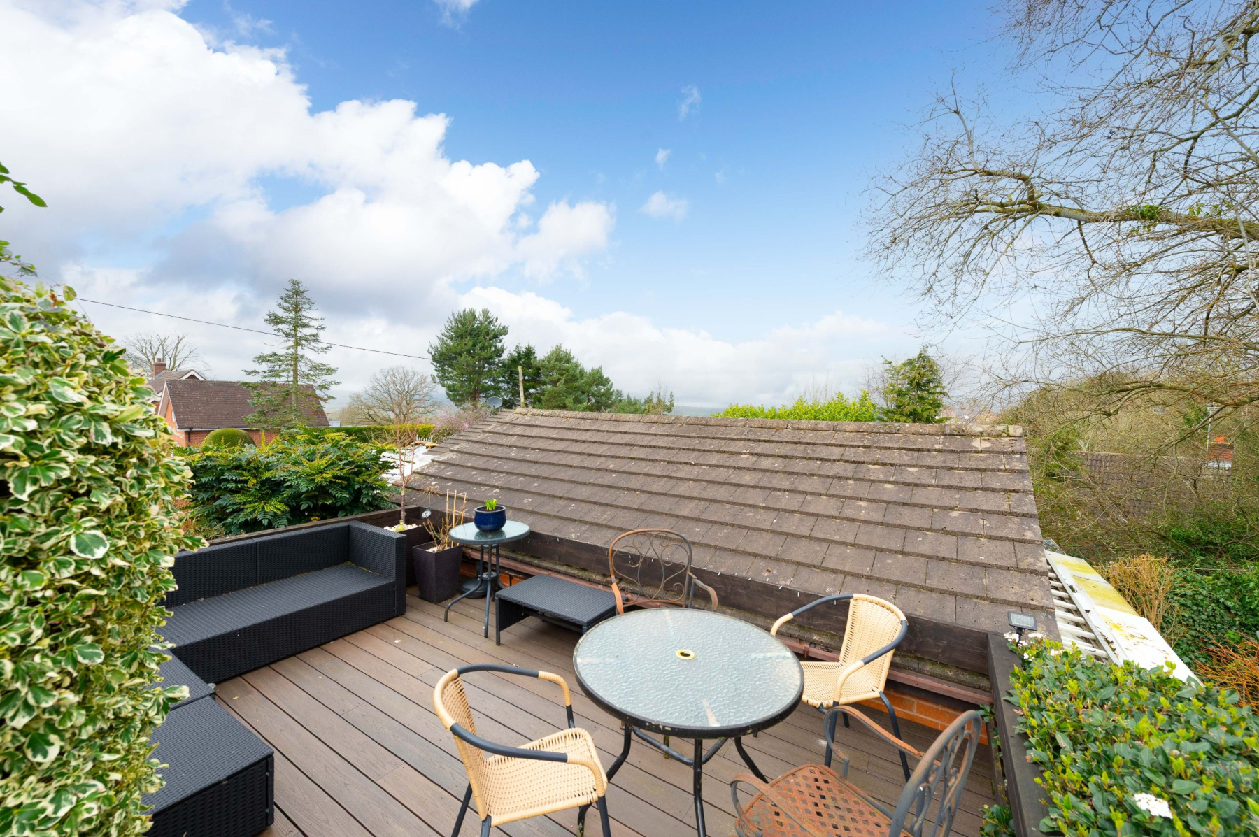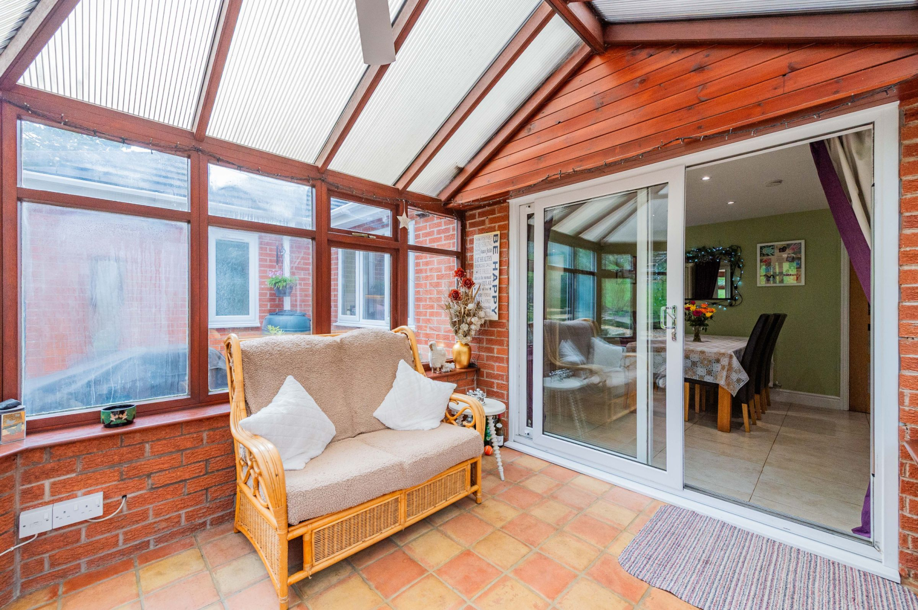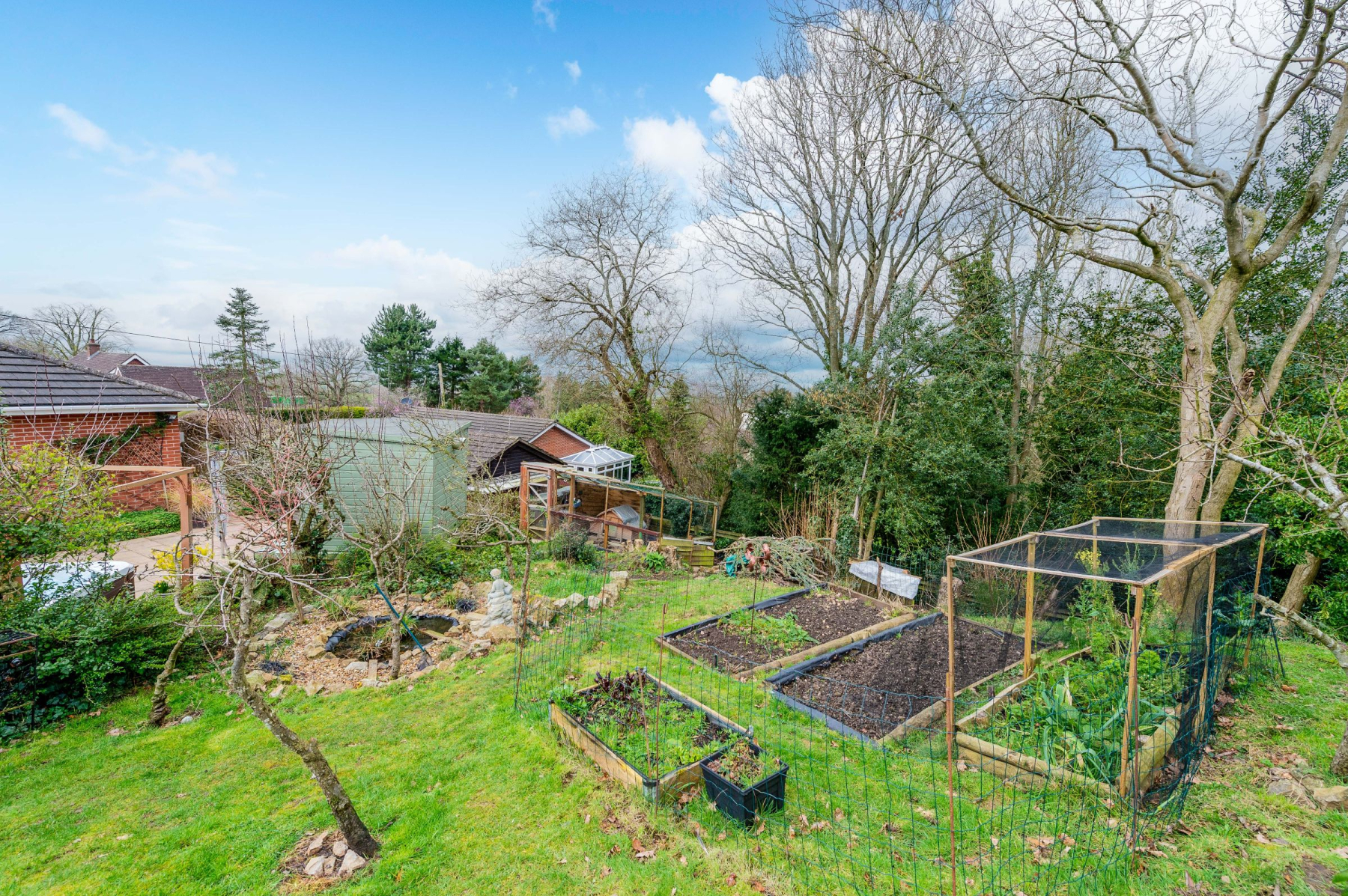 The accommodation is exceptionally generous and thoughtfully arranged to maximise both privacy and social flow. The main residence features a welcoming porch and a central hallway that serves as the heart of the home, leading to a sprawling lounge with triple-aspect views, two bedrooms with bespoke fitted wardrobes, a modern family shower room, and a high-specification open-plan kitchen and dining area. This culinary hub opens into a bright conservatory, which in turn grants access to the wrap-around patio and a luxurious hot tub area. Connected via the kitchen-yet possessing its own private external entrance-is the self-contained annexe, comprising two further double bedrooms (one with a kitchenette) and a dedicated shower room. Externally, the property sits on an expansive plot that transitions from a Mediterranean-style wrap-around patio to a lush, tiered garden. The grounds are a horticulturalist's dream, featuring an 18-tree orchard, a nature pond, a summerhouse, a raised vegetable garden, and a secure chicken coop, all supported by a detached garage and two separate driveways providing parking for at least four vehicles.