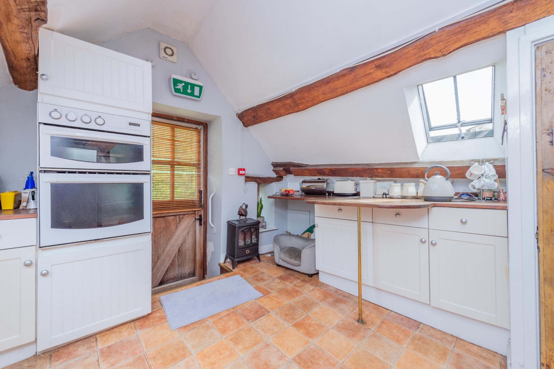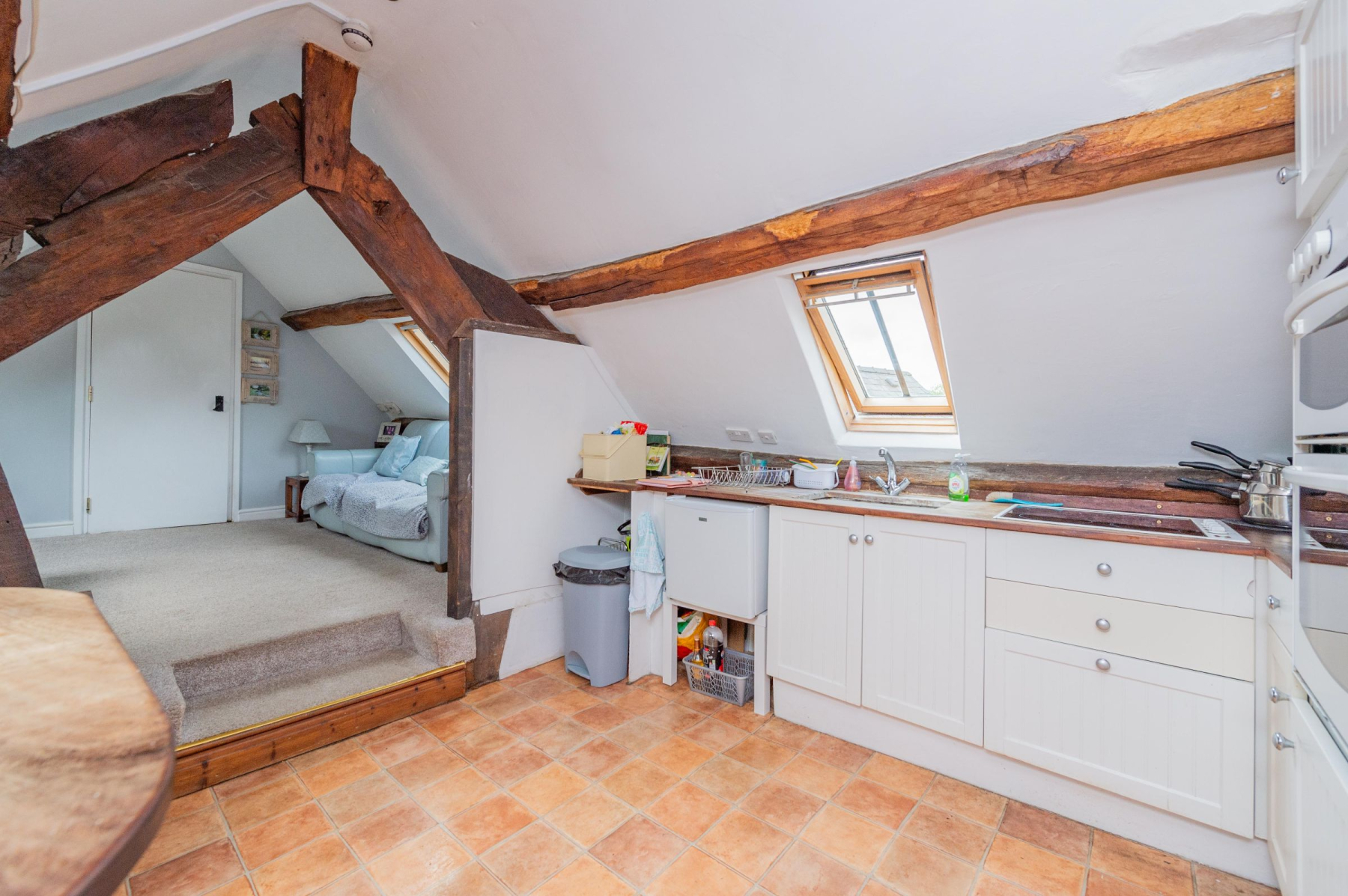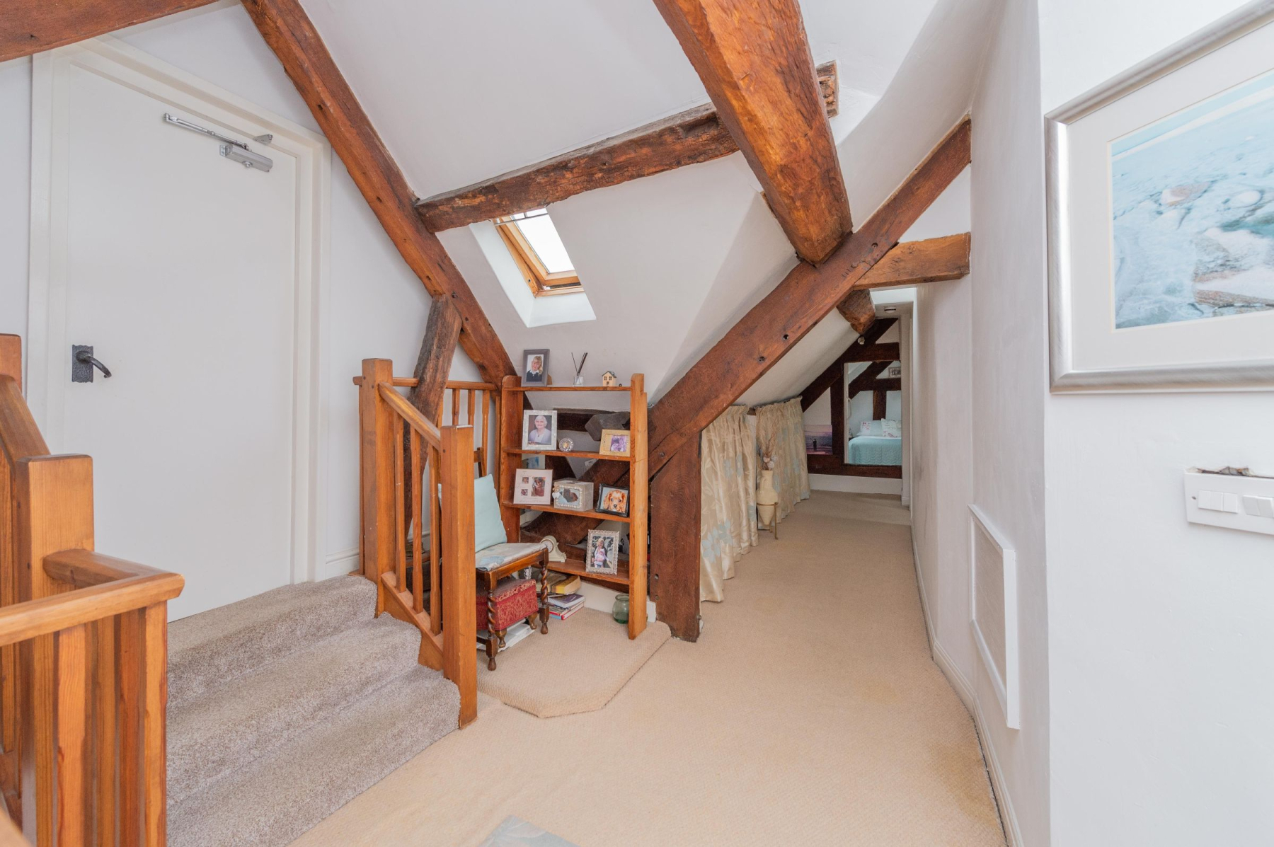 A discreet door on the first floor beckons you upwards, revealing a staircase leading to the pinnacle of The Poppy House - a private sanctuary bathed in natural light. A spacious landing unfolds before you, its vaulted ceiling adorned with exposed beams, setting the stage for a truly unique living experience.