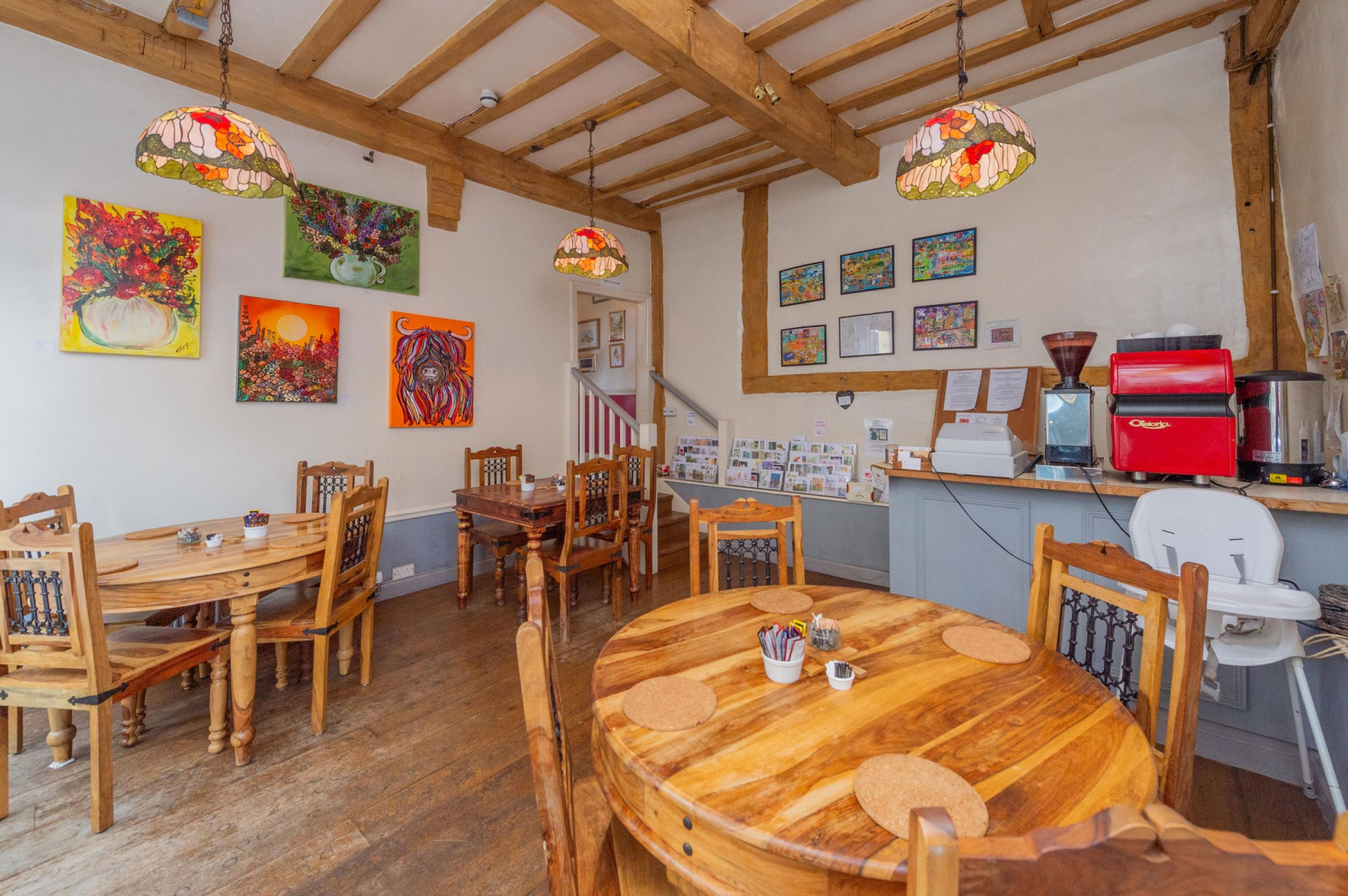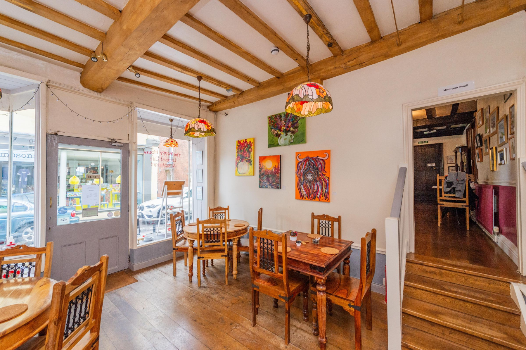 Step through the inviting double shop front of The Poppy House and be greeted by a light-filled haven. The characterful café boasts a welcoming counter, its warmth accentuated by exposed beams crisscrossing both walls and ceiling.
