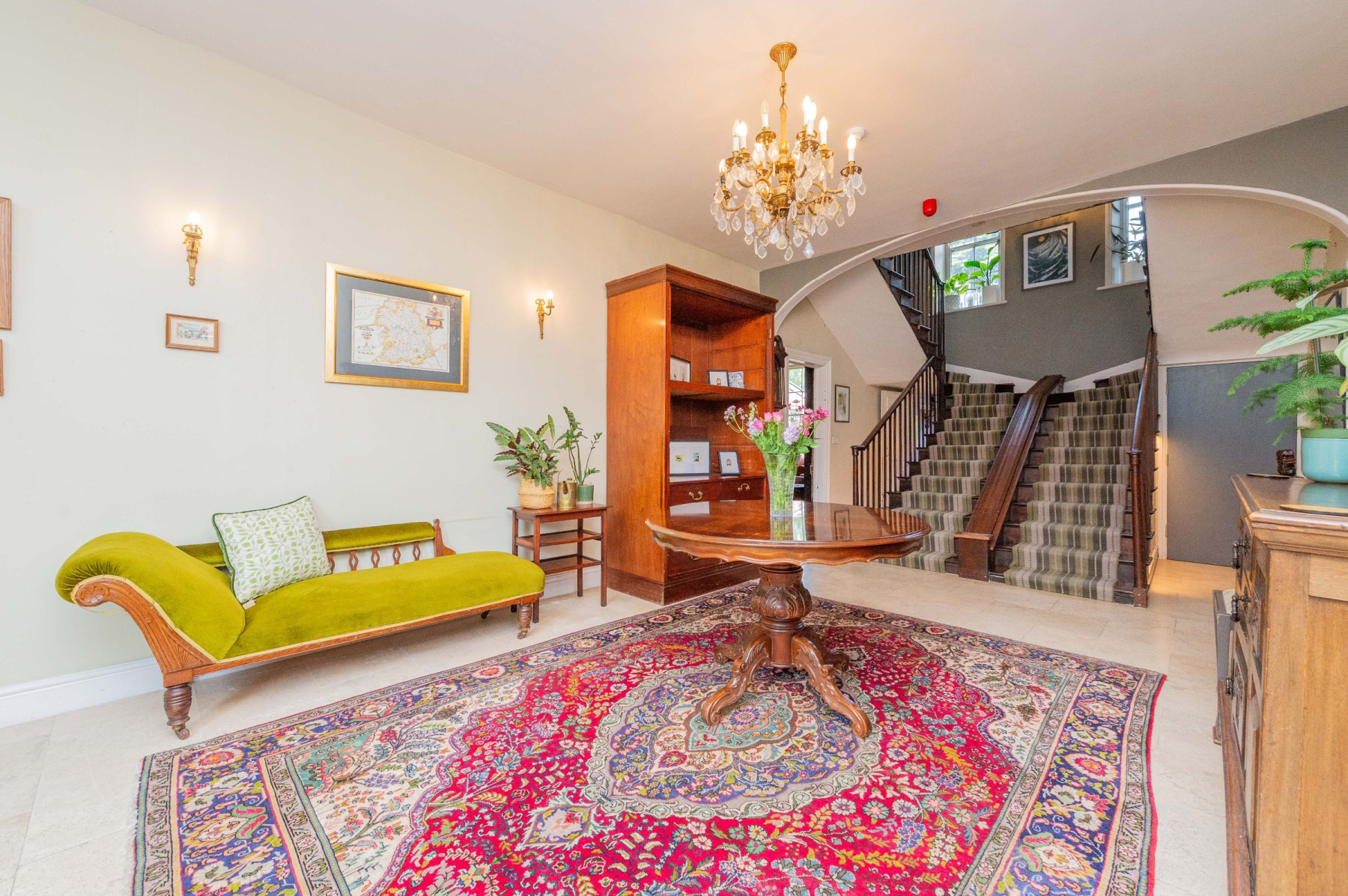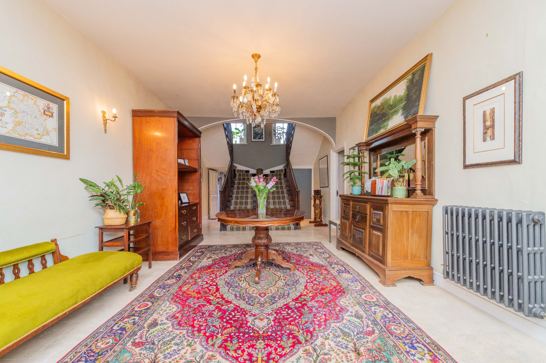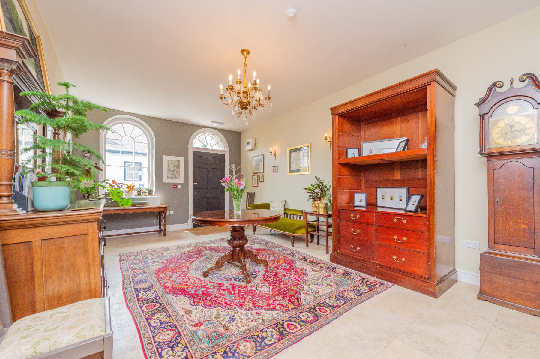 Set back with a raised frontage from the bustling High Street, Bank House enjoys a surprisingly private and commanding presence. The impressive front door opens into a Grand Hallway that immediately sets a tone of historic elegance and impressive scale. Features include beautiful stone flooring, high ceilings, and the truly unique Double Staircase, an architectural marvel that gracefully ascends the entire height of the house. Magnificent arched windows above the central staircase, mirrored by similar windows to the side of the front door, flood this welcoming space with natural light.