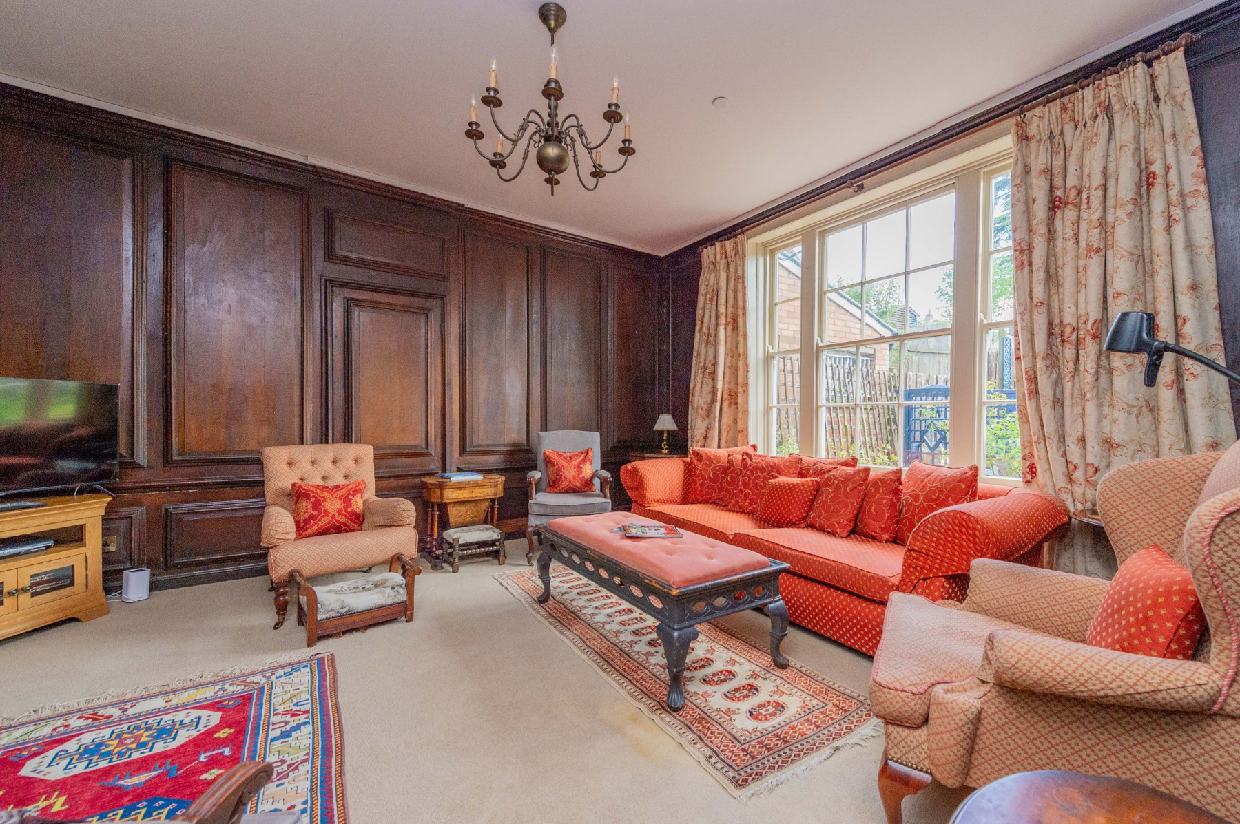 The Large Sitting Room is a testament to Georgian grace, featuring exquisite 18th-century oak panelling and a handsome fireplace housing a multifuel Clearview stove. A huge sash window offers delightful views onto the private rear garden.