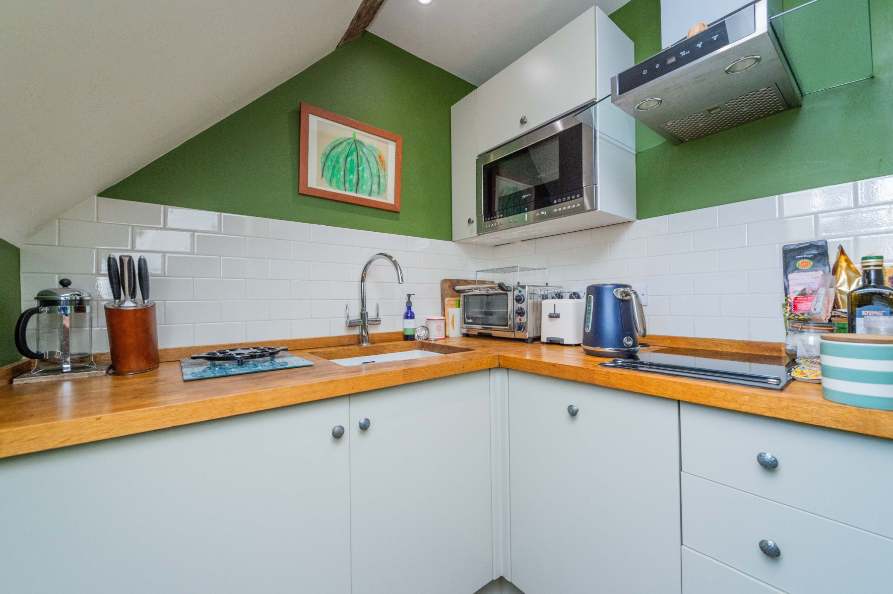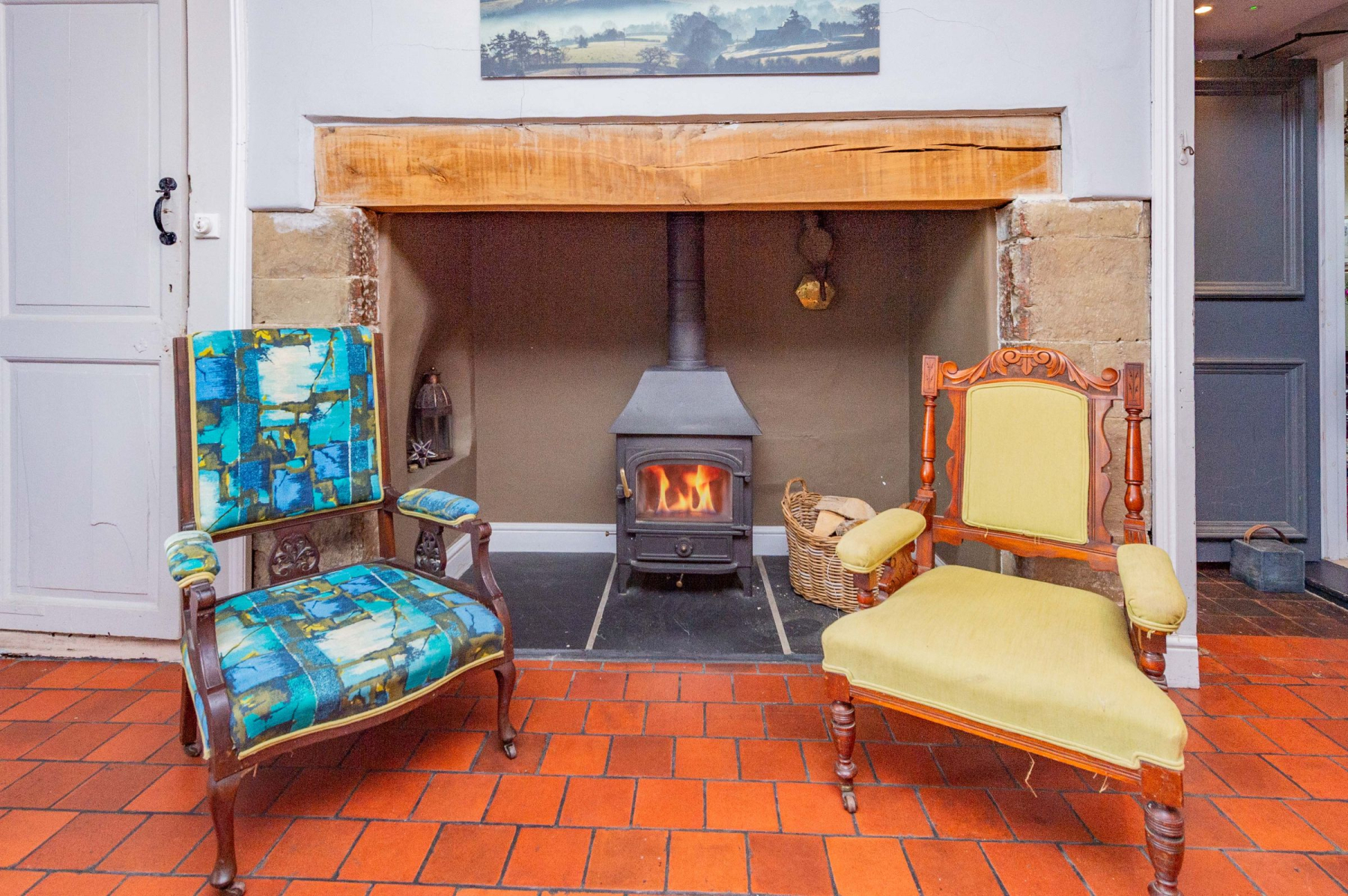 A further door from the hallway leads to the Kitchen, with a separate Lobby acting as a convenient passageway between the kitchen and dining room. The Kitchen itself is both grand and generously proportioned, thoughtfully designed for modern living. It features an extensive range of fitted timber storage units, complemented by a suite of integrated appliances including a double oven, microwave, dishwasher, induction hob and Quooker boiling water tap. A Rangemaster cooker with a 5-ring gas hob takes pride of place. A particularly beautiful feature is the large inglenook fireplace with an exposed oak beam, now home to another Clearview multifuel stove, adding immense character. Quarry tiled flooring adds warmth and practicality, while a large sash window overlooks the picturesque garden.