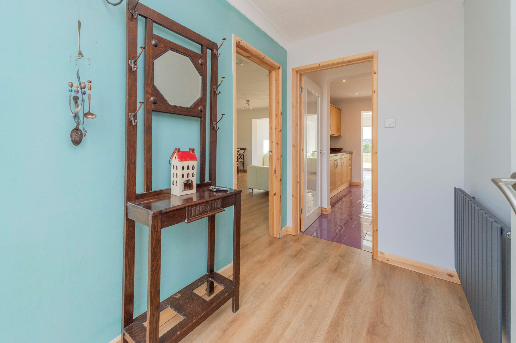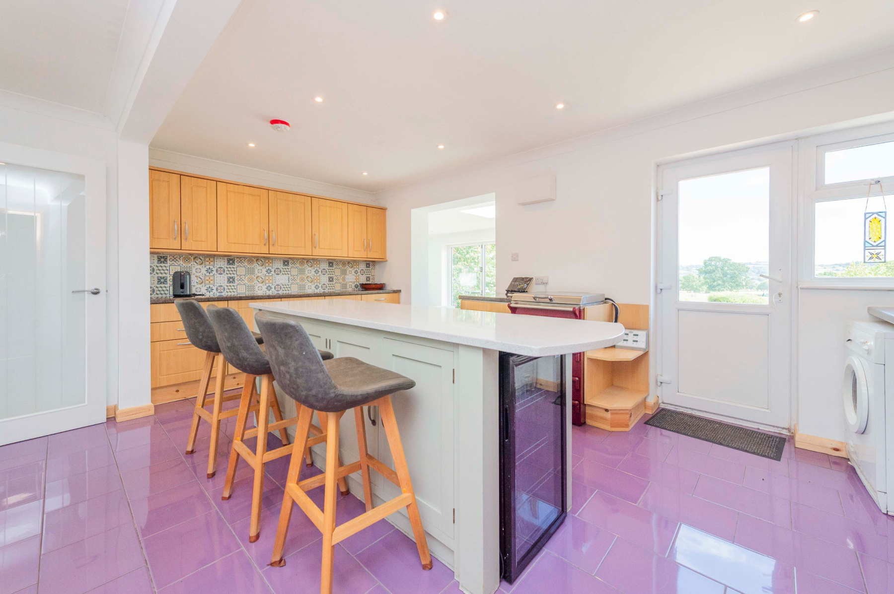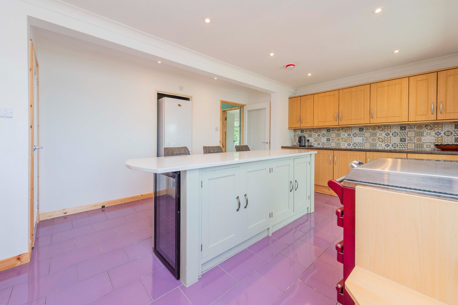 Flowing seamlessly from the sunroom is a modern kitchen, fitted with glossy tiled flooring and timber cupboards. With a composite sink, ample work surface, and space for a washing machine and dishwasher, it's a practical and stylish space. A glazed door and a large window offer further views of the rear garden, ensuring the natural beauty is never far from sight.