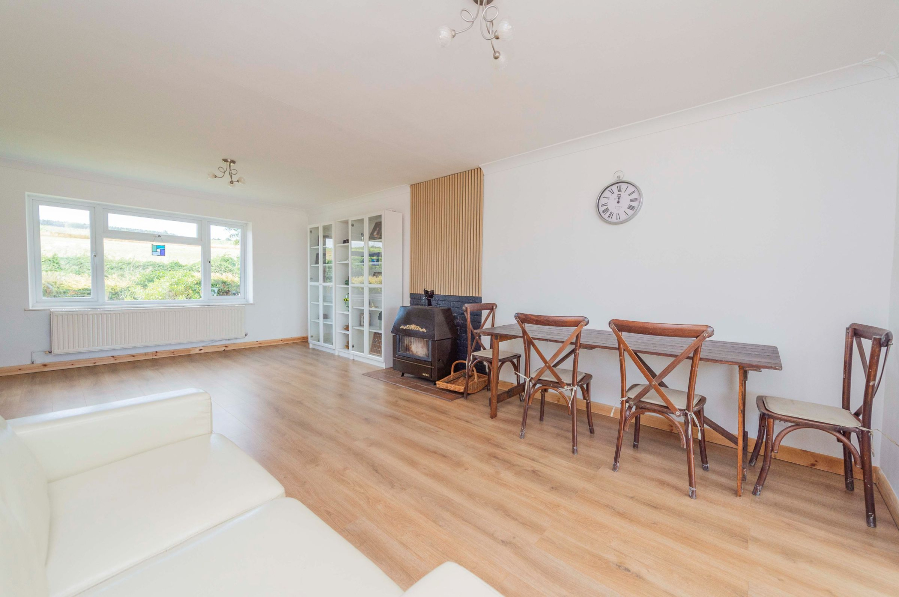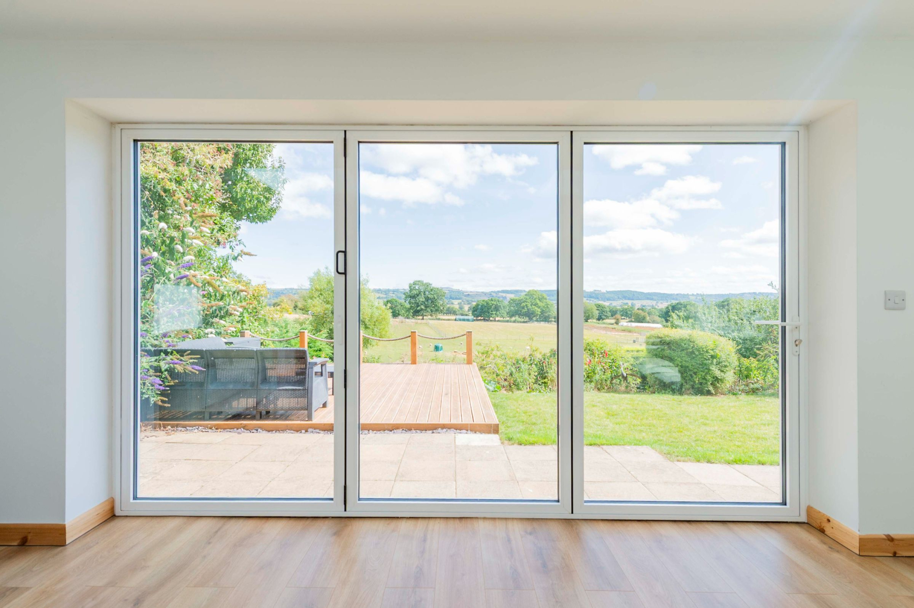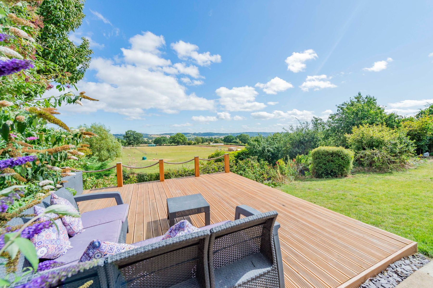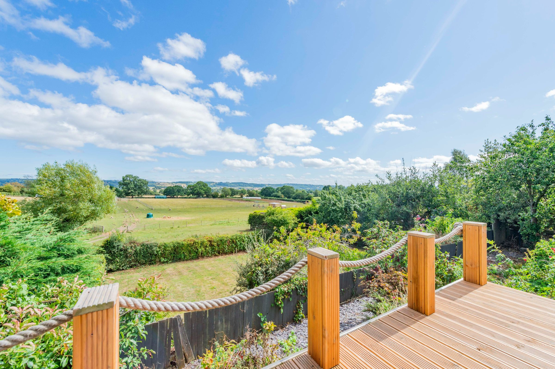 This entire living area is designed to make the most of the magnificent landscape. The sunroom offers awe-inspiring panoramic views over rolling fields and distant hills, where goats, sheep, and cows from a neighbouring smallholding graze peacefully, creating an ever-changing natural painting. Step through the bi-fold doors onto the wrap-around terrace, a space that feels like an extension of the living room itself. From here, you can ascend to a raised decked area, the ideal spot to relax with a morning coffee or an evening glass of wine as you soak in the spectacular scenery.