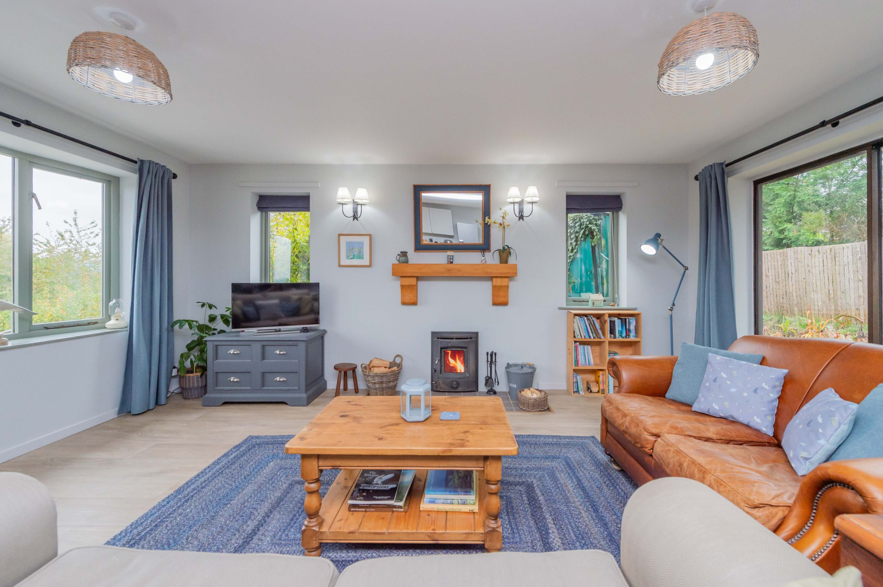 Step inside to an impressive, naturally lit Open Plan Living/Dining/Kitchen space, meticulously designed to maximise the spectacular, uninterrupted scenery. Wood effect tile flooring with underfloor heating flows throughout, creating a warm and welcoming atmosphere. The focal point of the living area is a striking cast iron Aga wood stove set on a quarry tile hearth with a wooden mantle, perfect for cosy evenings. The room benefits from large double-glazed windows on three sides, perfectly framing the exceptional views across the extensive garden and the rolling Shropshire countryside, with Pontesford Hill taking centre stage in the dramatic backdrop.