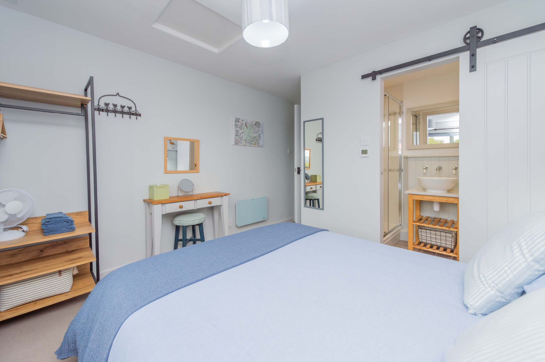 Bedroom 1 is a haven of relaxation with spectacular, far-reaching views across the garden and countryside, a contemporary electric panel heater, and a feature wall with tongue and groove panelling and inset bedside lamps. A stylish character barn sliding door leads to a very stylish En-suite Shower Room, fully equipped with a tiled shower cubicle, rainfall shower, a circular wash basin set to a wooden stand, and grey quarry tile flooring.