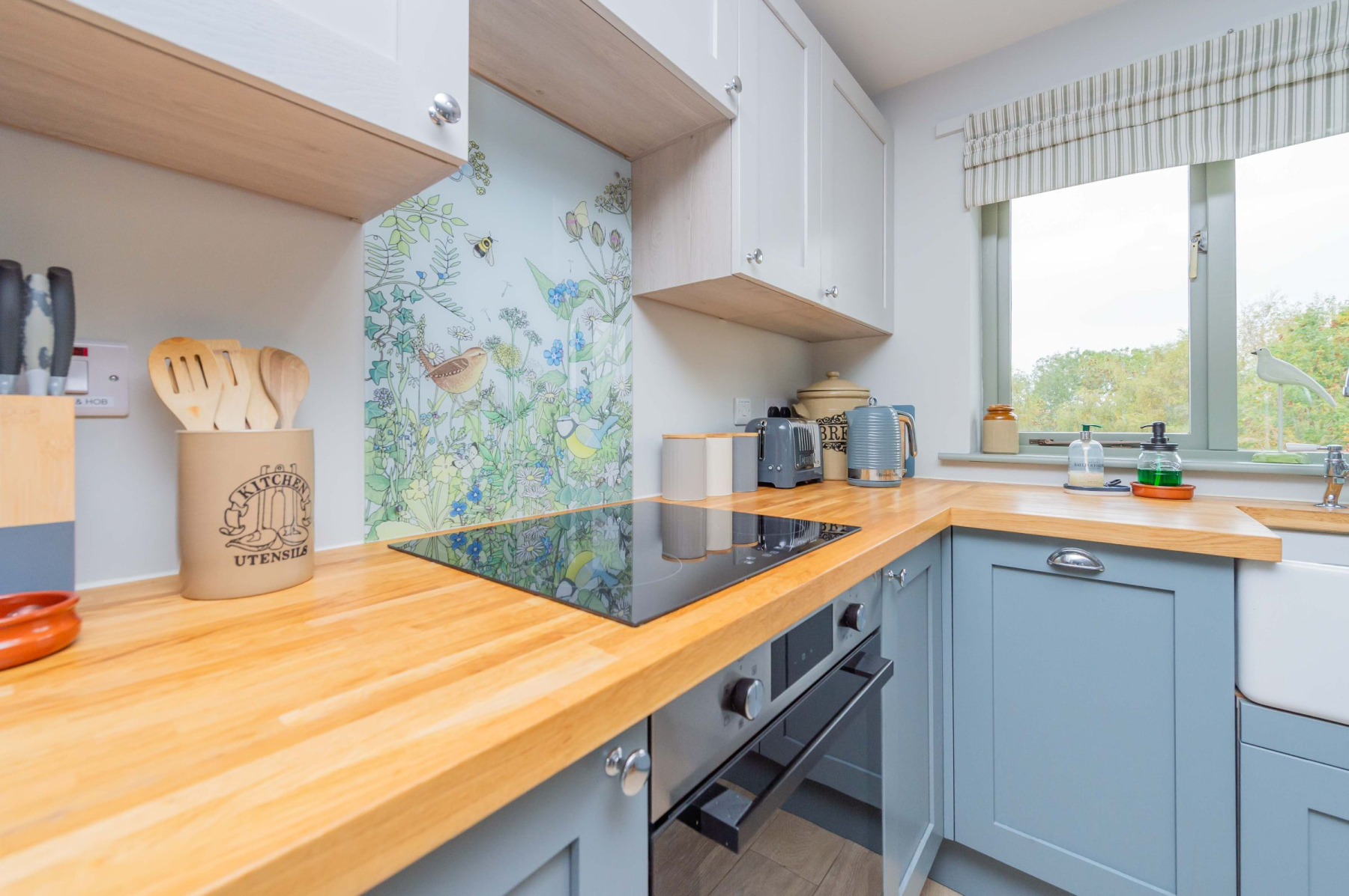The Kitchen Area is a masterpiece of contemporary country style, featuring solid wood worktops with a classic Belfast sink, a series of elegant base and eye-level units, an integrated electric oven with a 4-ring ceramic hob, and a designer glass splash-back. Integrated appliances include a washing machine and slim-line dishwasher. Double-glazed patio doors lead out to a private rear courtyard garden, ideal for catching the morning sun.