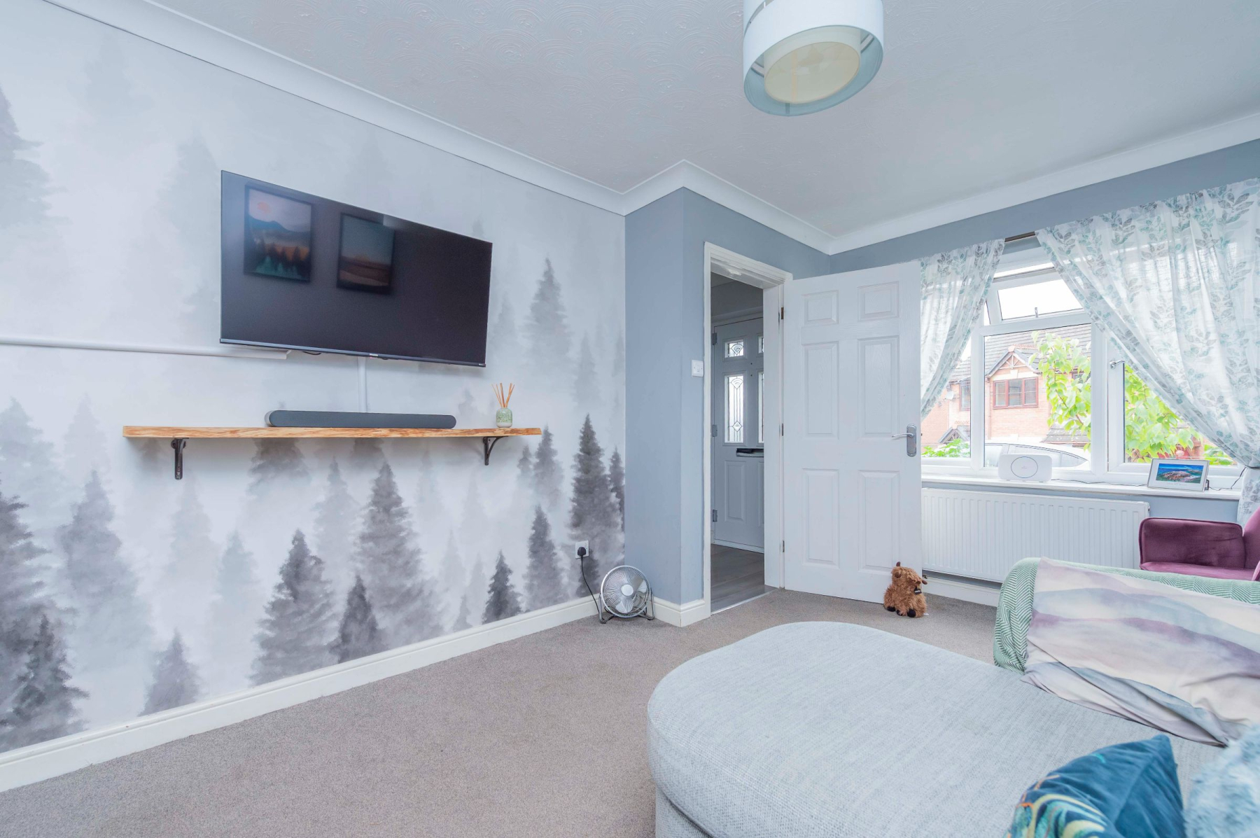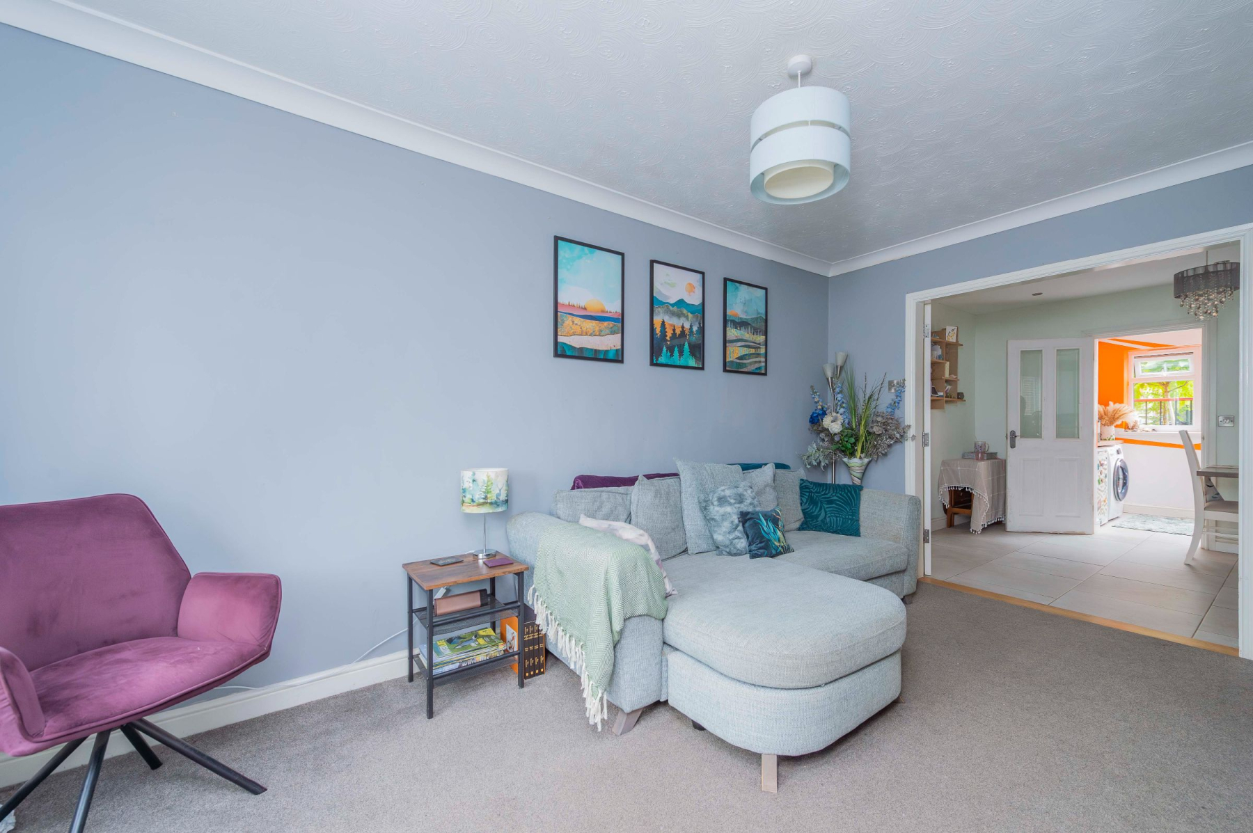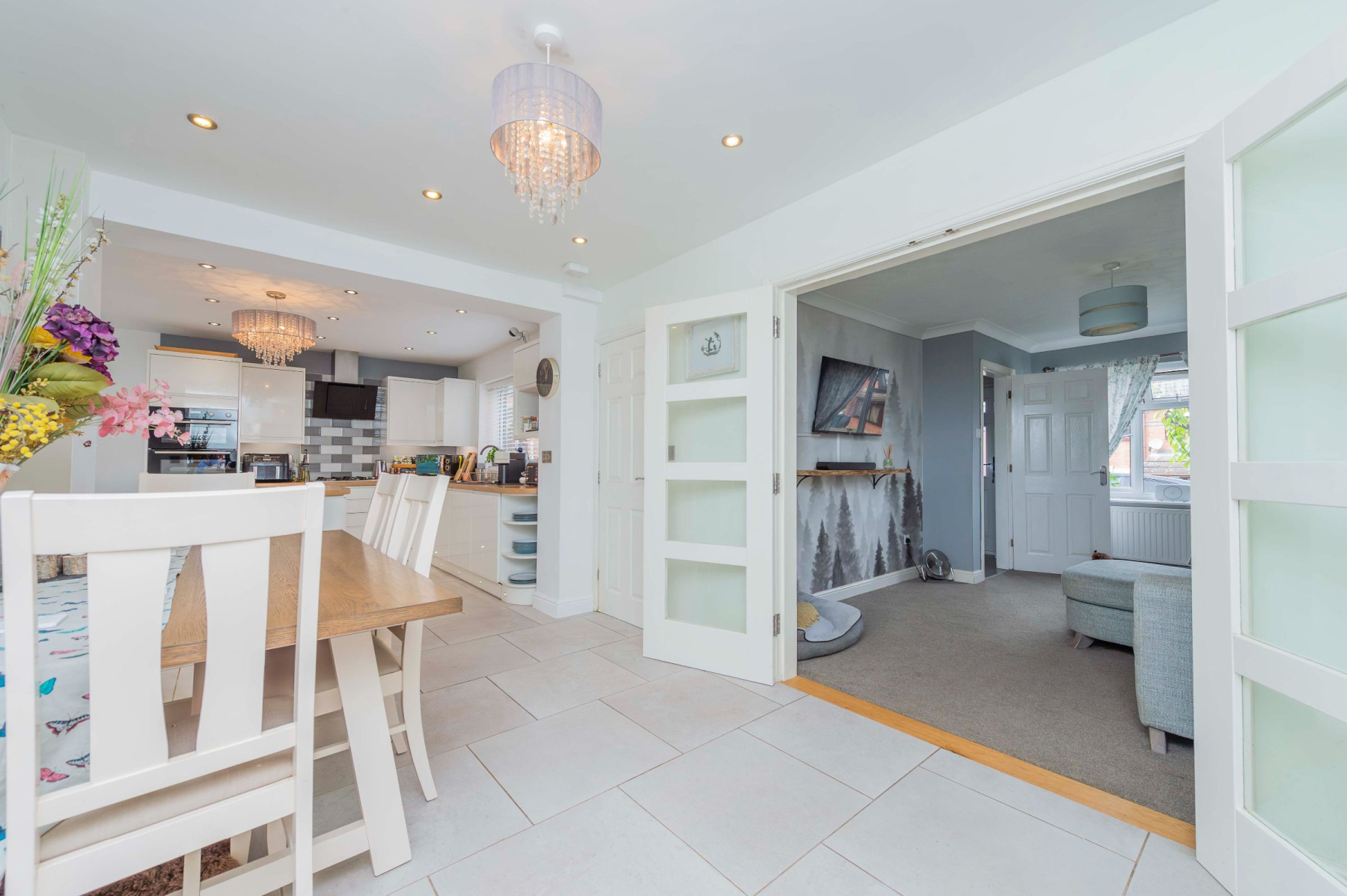 A composite double-glazed entrance door with a canopy over welcomes you into the inviting hallway, where wood-effect flooring and a radiator set a warm tone. From here, stairs rise to the first floor, and a door leads into the cosy lounge. With its UPVC double glazed window to the front and fitted carpet, it's a perfect space for relaxation. Wooden framed glazed doors from the lounge open to the main living area, creating a sense of light and flow.