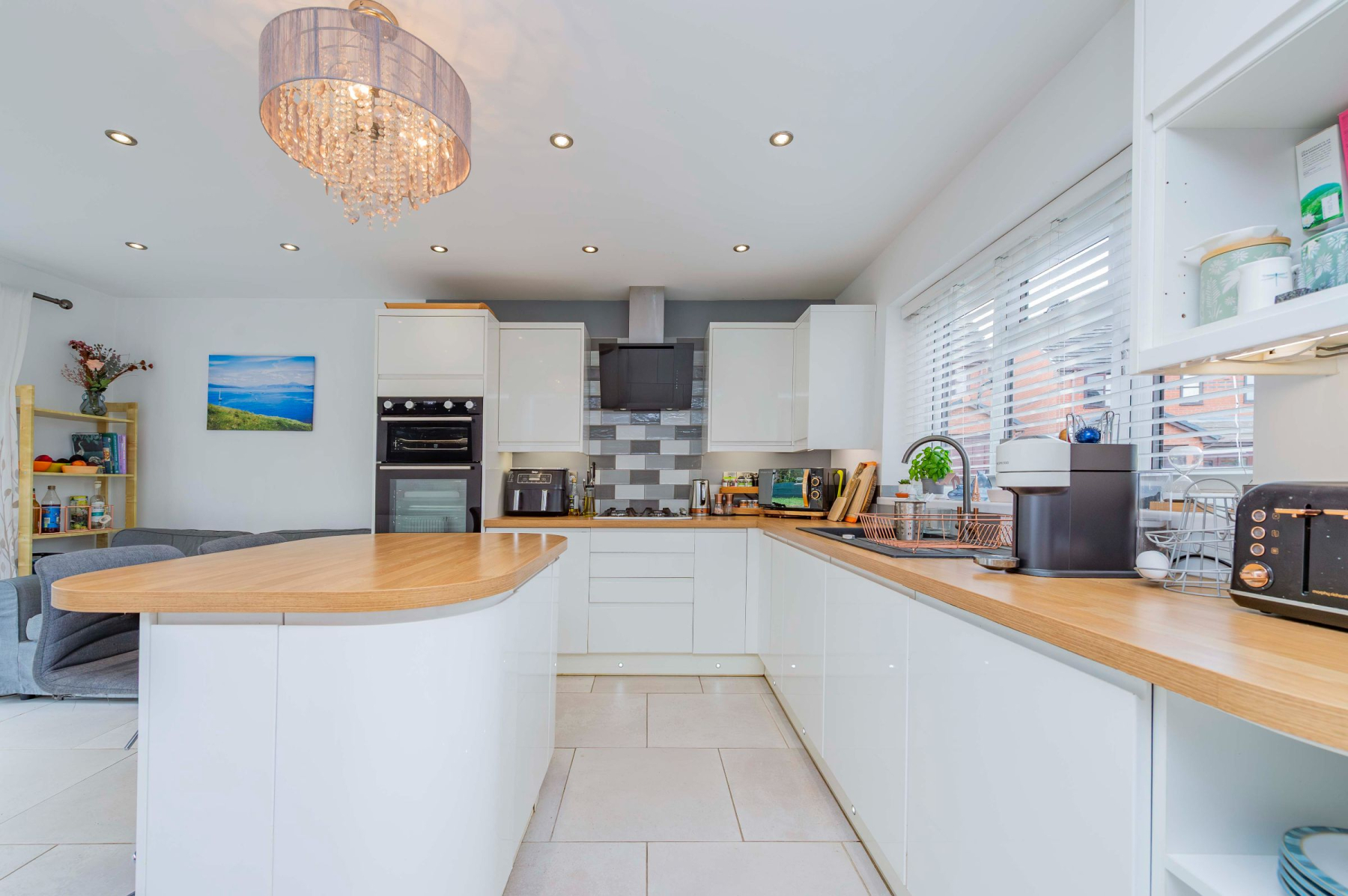 Prepare to be captivated by the impressive open-plan re-fitted kitchen/diner with family area, the true heart of this home. The dining area boasts a sleek tiled floor and LED spotlights, with a handy under-stairs store cupboard housing the gas-fired combination boiler. The kitchen area is a chef's dream, featuring a range of contemporary gloss white eye-level and base units, an integrated double oven, fridge, dishwasher, and microwave. Fitted wooden-style worktops with an inset sink and a breakfast bar with fitted cupboards and a wood-effect worktop provide ample preparation and storage space. A wall-hung cooker extractor fan with a four-ring gas hob and under-unit lighting complete this modern space.