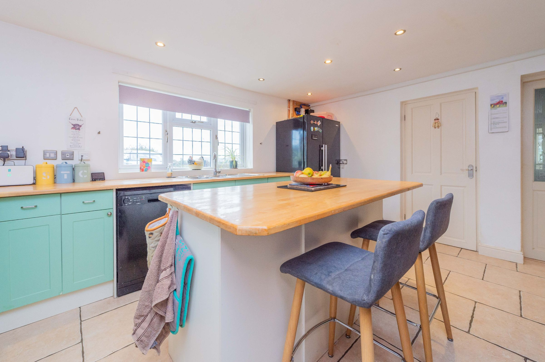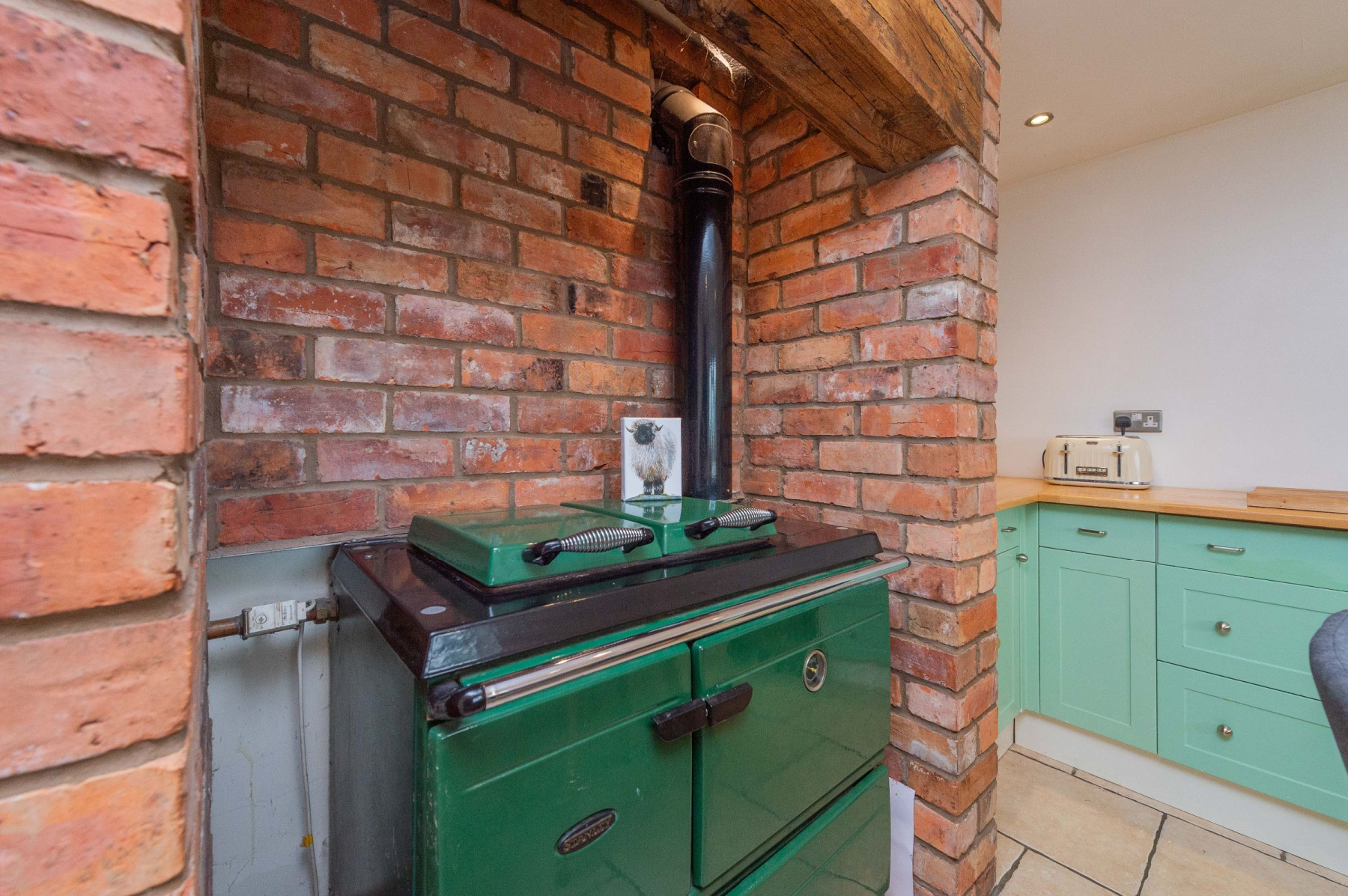 Straight ahead from the hall is the heart of the home, a delightful country-style kitchen. This space features charming shaker-style floor-level units with timber worksurfaces, complemented by an exposed brick chimney with a country-green Stanley range cooker set beneath a rustic timber beam. A window to the side elevation allows natural light to stream in, and a sink is perfectly positioned beneath it. The kitchen is well-equipped with space and plumbing for a dishwasher. Leading off the kitchen is a great utility room, a true laundry space with plumbing and space for a washing machine and drier, a butler sink, and additional storage units. A window to the side ensures this space is also bright and airy.