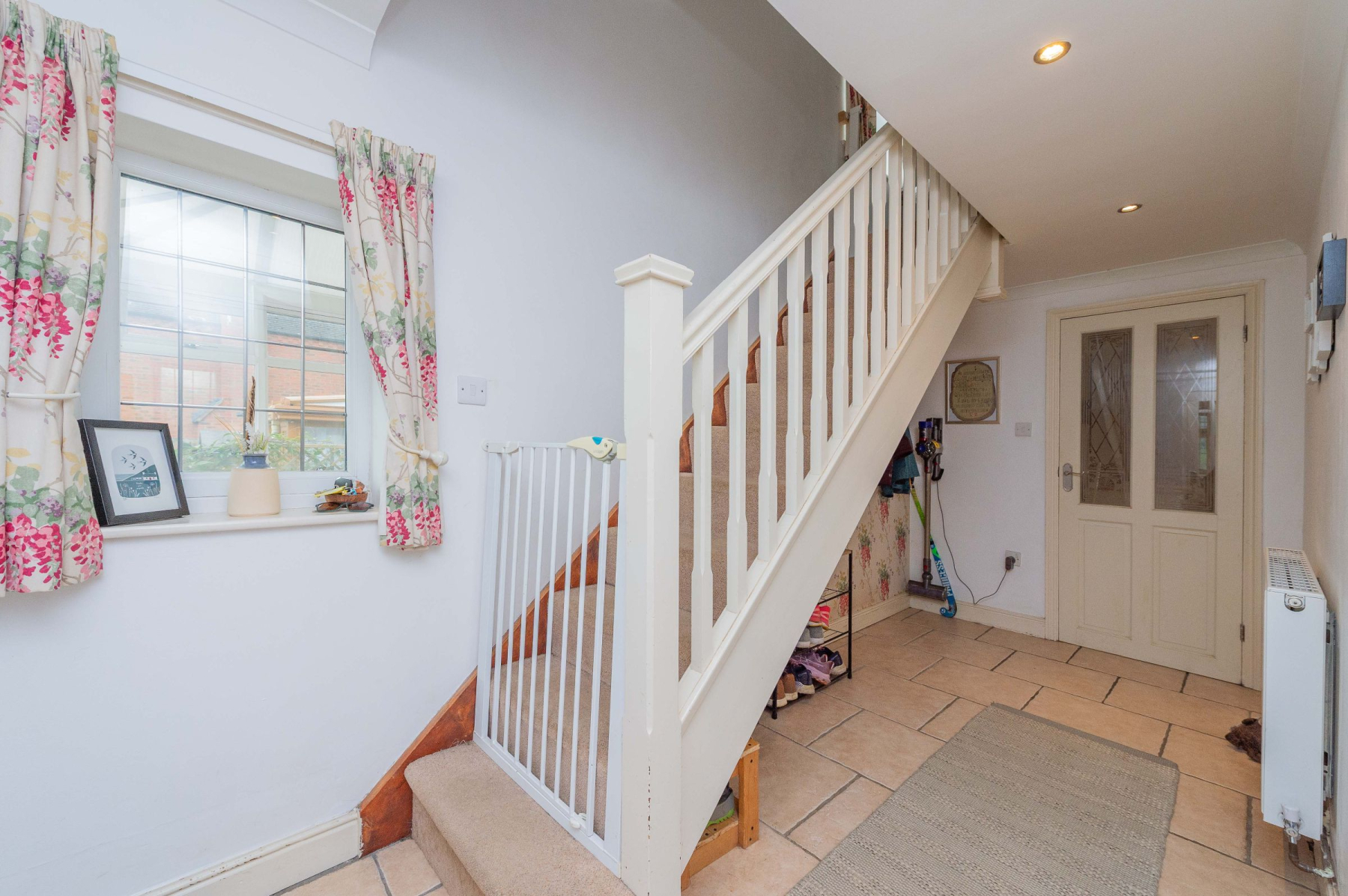 Enter this beautifully presented home through a handy porch, perfect for kicking off muddy boots and coats before stepping into the light and welcoming hallway. The tiled floor extends from the porch through to the hallway and into the kitchen, creating a seamless and practical flow. To your right, a convenient ground floor shower room provides a guest cloakroom with a corner shower and a vanity basin, offering storage space underneath.